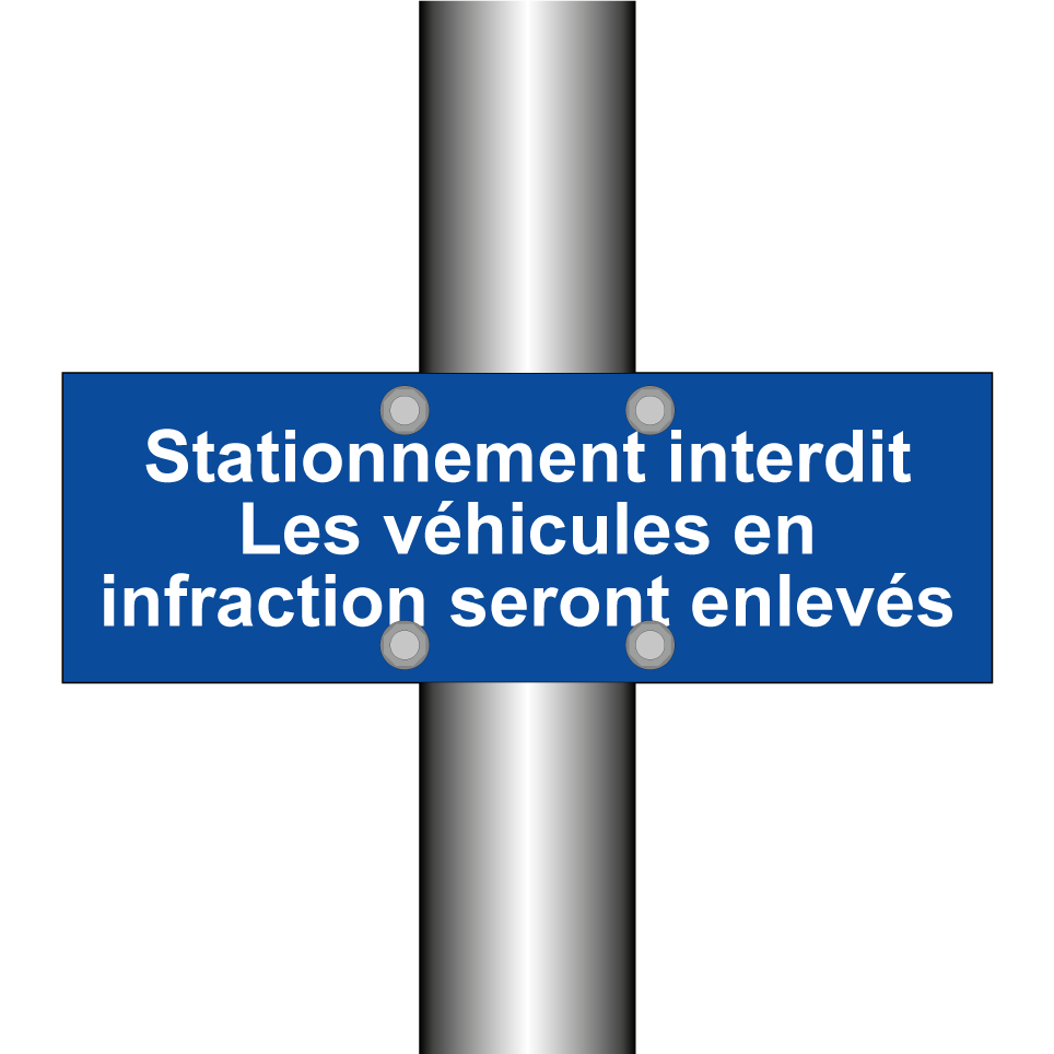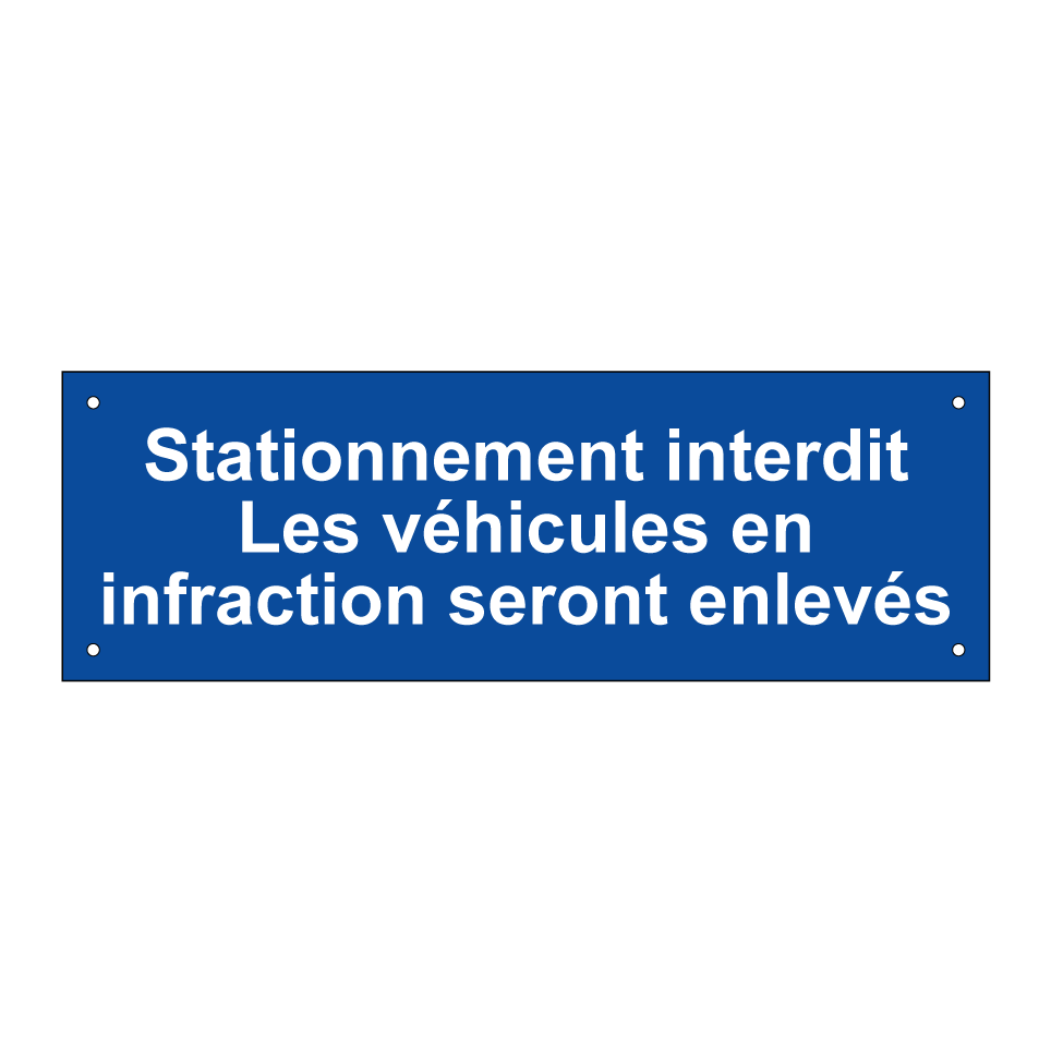 Panneau de stationnement avec le texte : "Stationnement interdit Les véhicules en infraction seront enlevés".