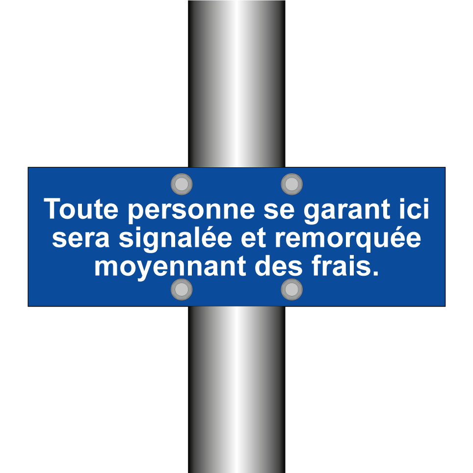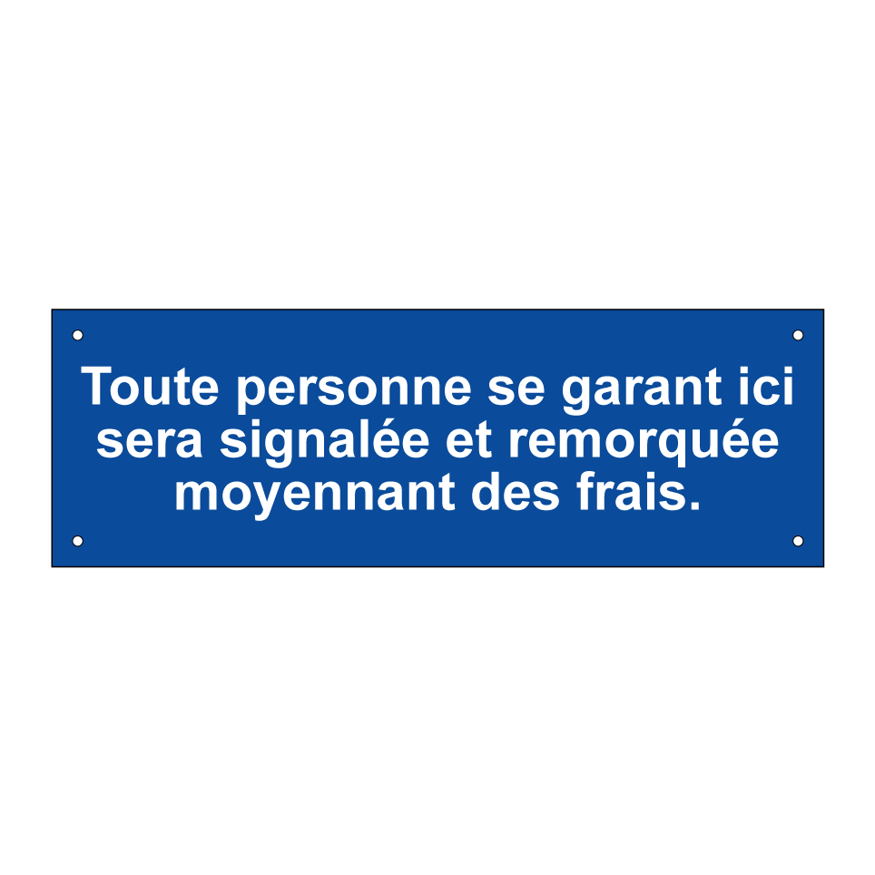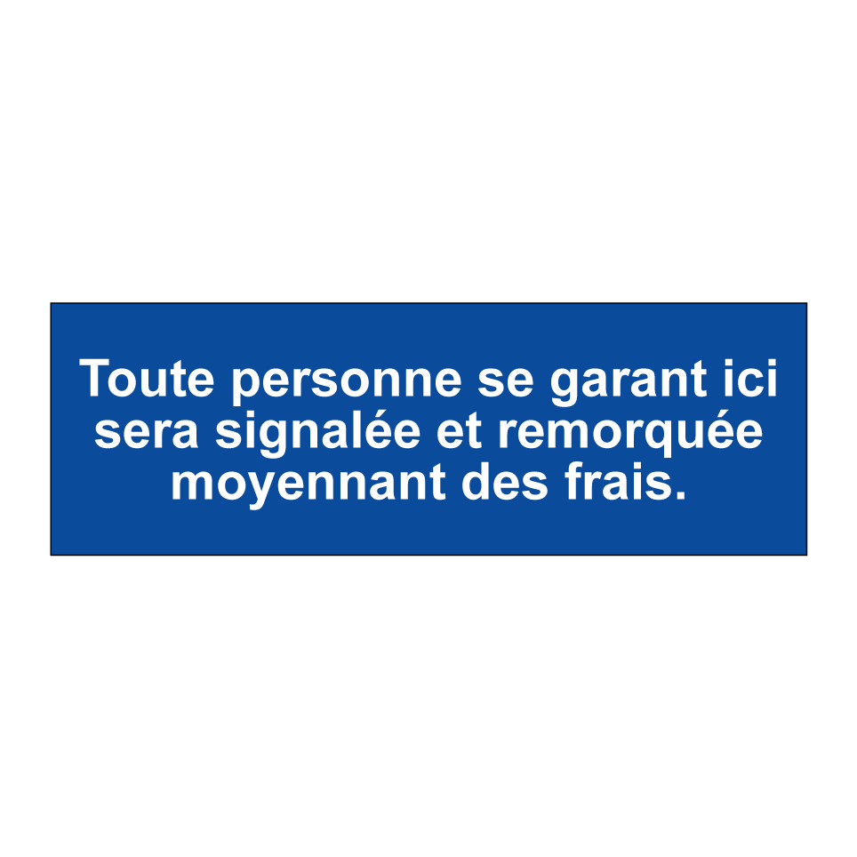 Panneau de stationnement avec le texte : "Toute personne se garant ici sera signalée et remorquée moyennant des frais.".