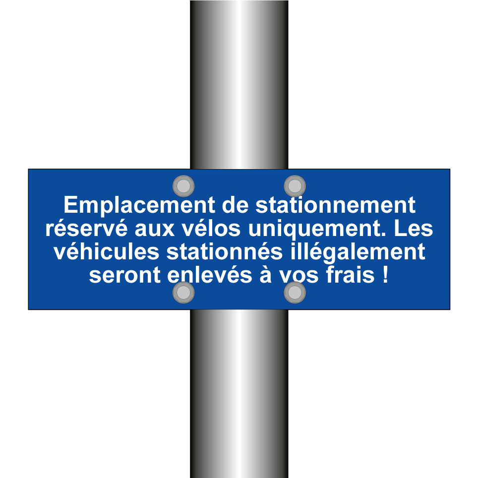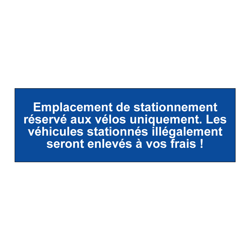 Panneau de stationnement avec le texte : "Emplacement de stationnement réservé aux vélos uniquement. Les véhicules stationnés illégalement seront enlevés à vos frais !".