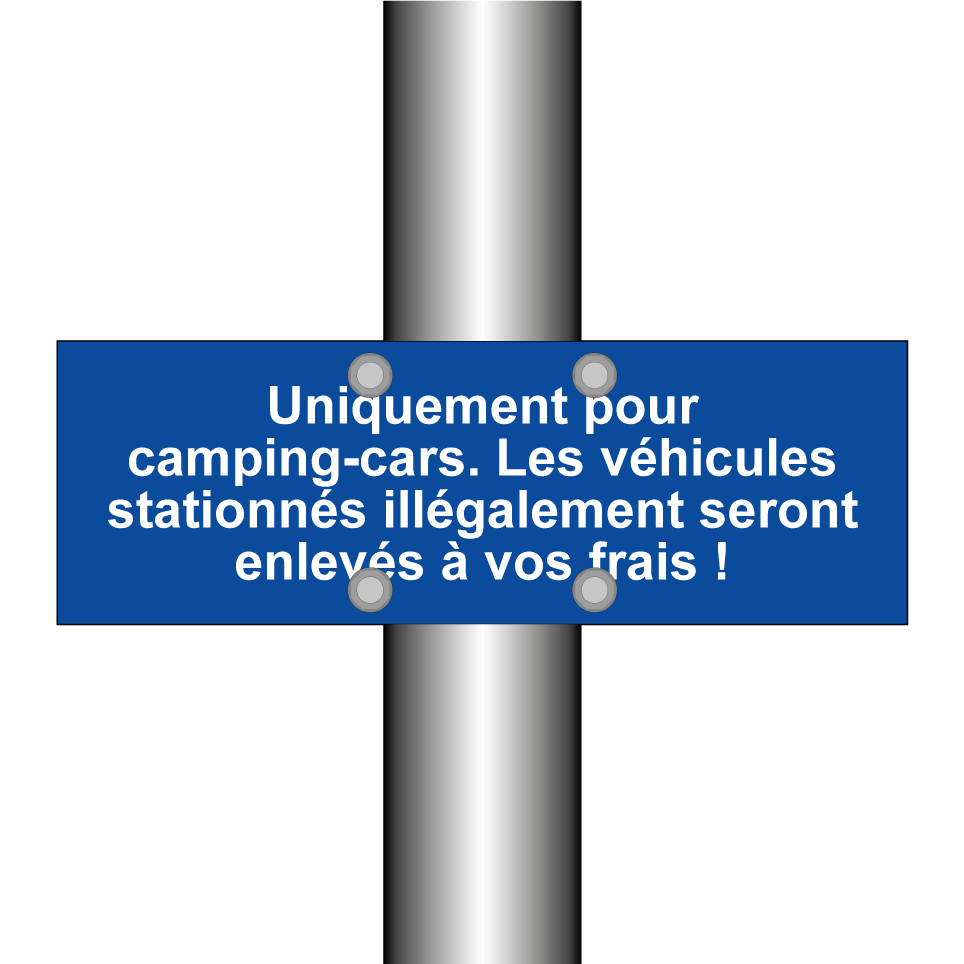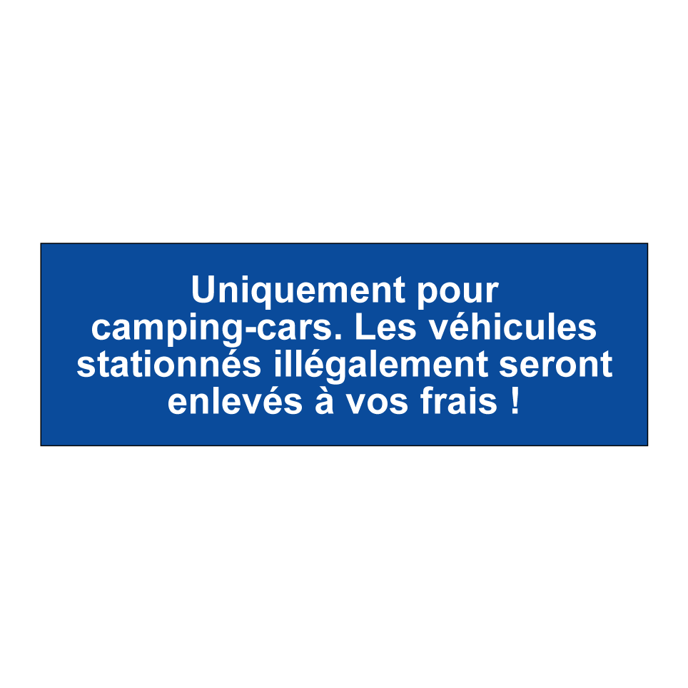 Panneau de stationnement avec le texte : "Uniquement pour camping-cars. Les véhicules stationnés illégalement seront enlevés à vos frais !".