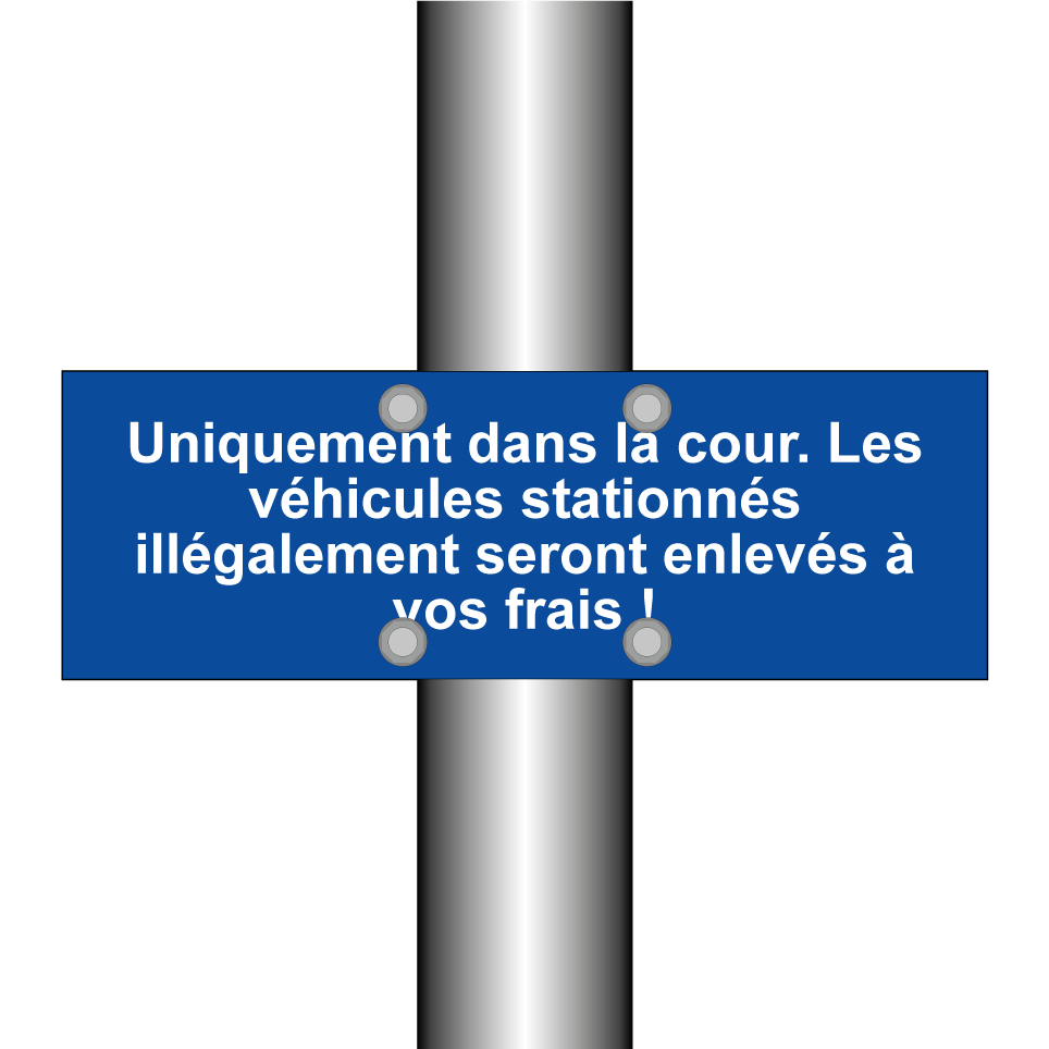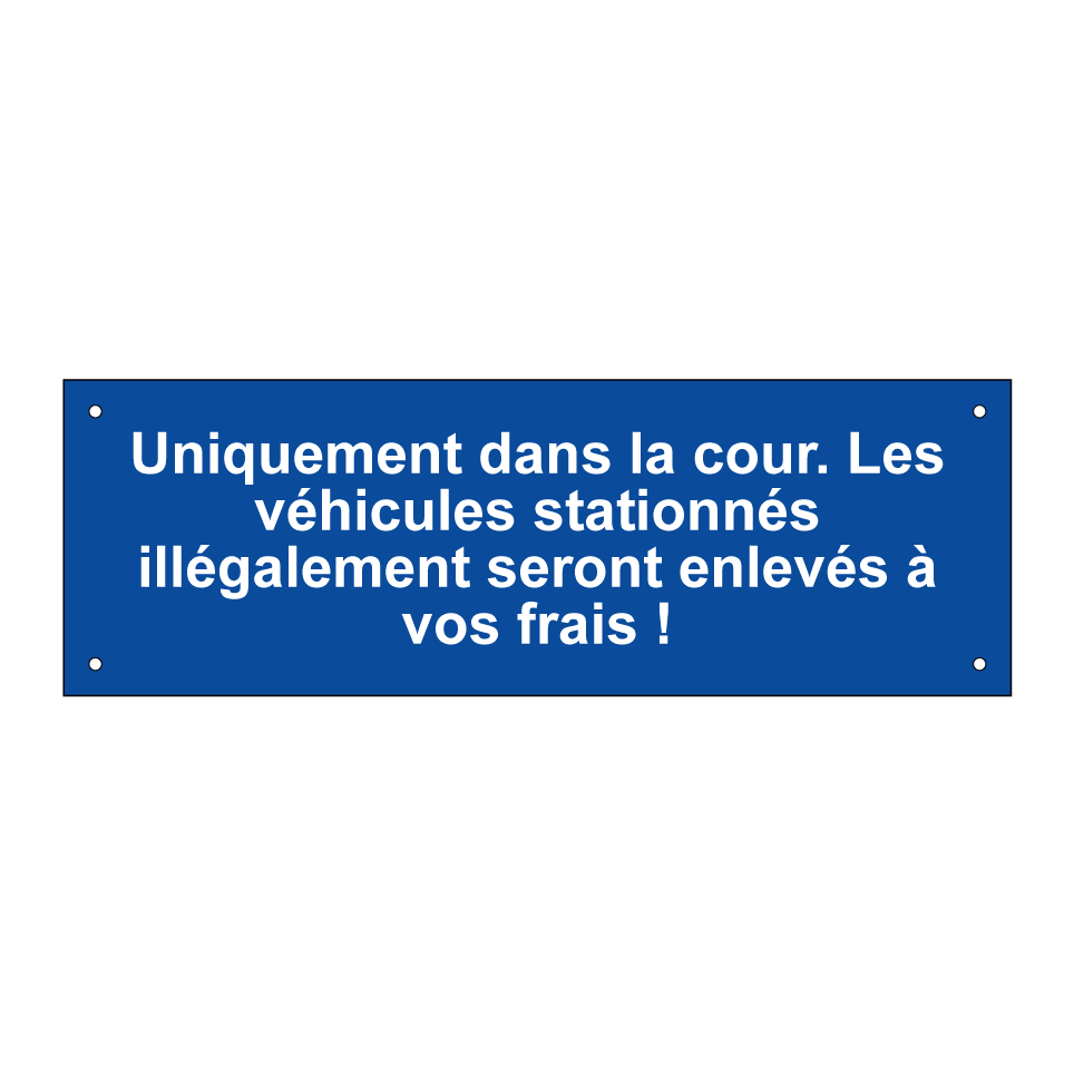 Panneau de stationnement avec le texte : "Uniquement dans la cour. Les véhicules stationnés illégalement seront enlevés à vos frais !".