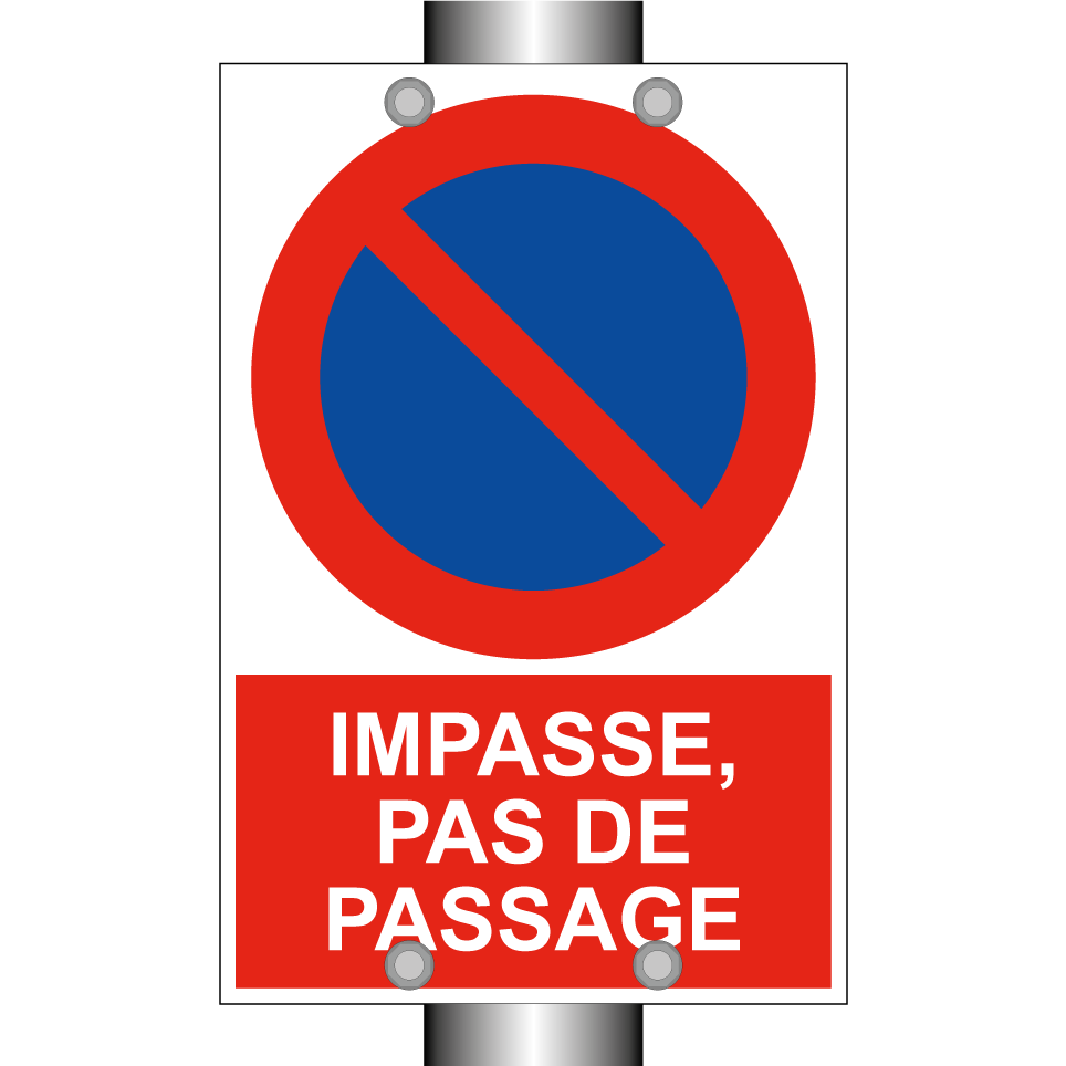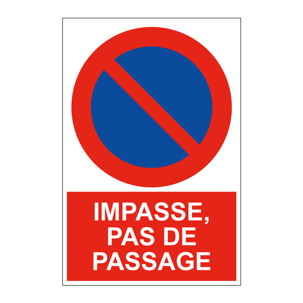Panneau d'interdiction de stationner avec le texte : "Impasse, pas de passage" et une symbolique claire.