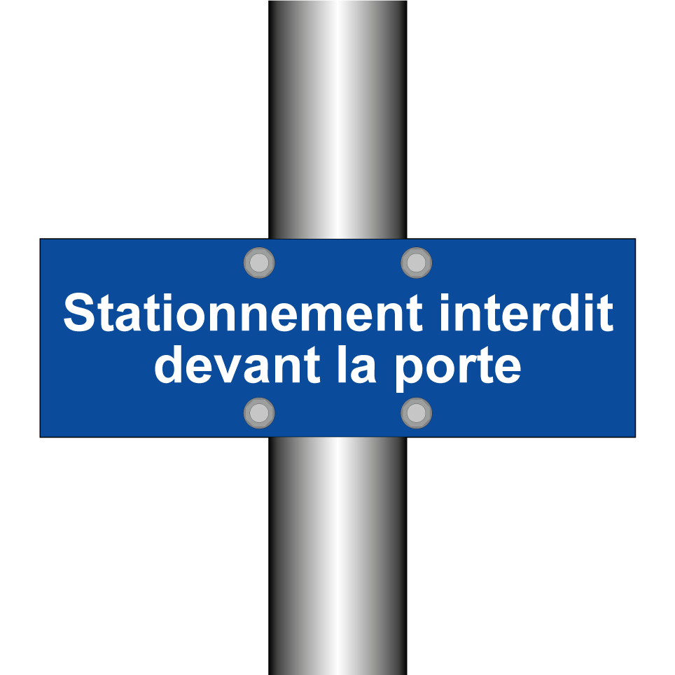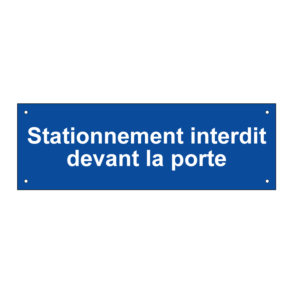 Panneau d'interdiction de stationner avec le texte : "Stationnement interdit devant la porte".