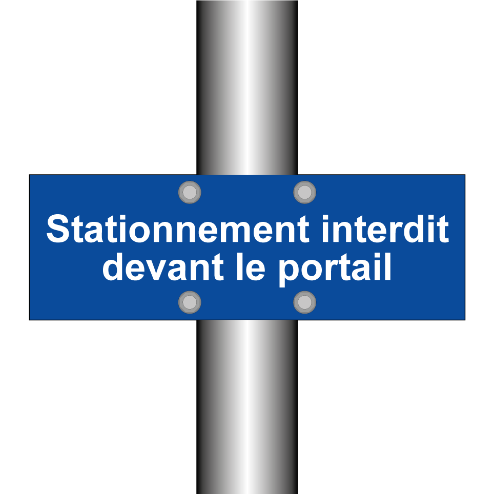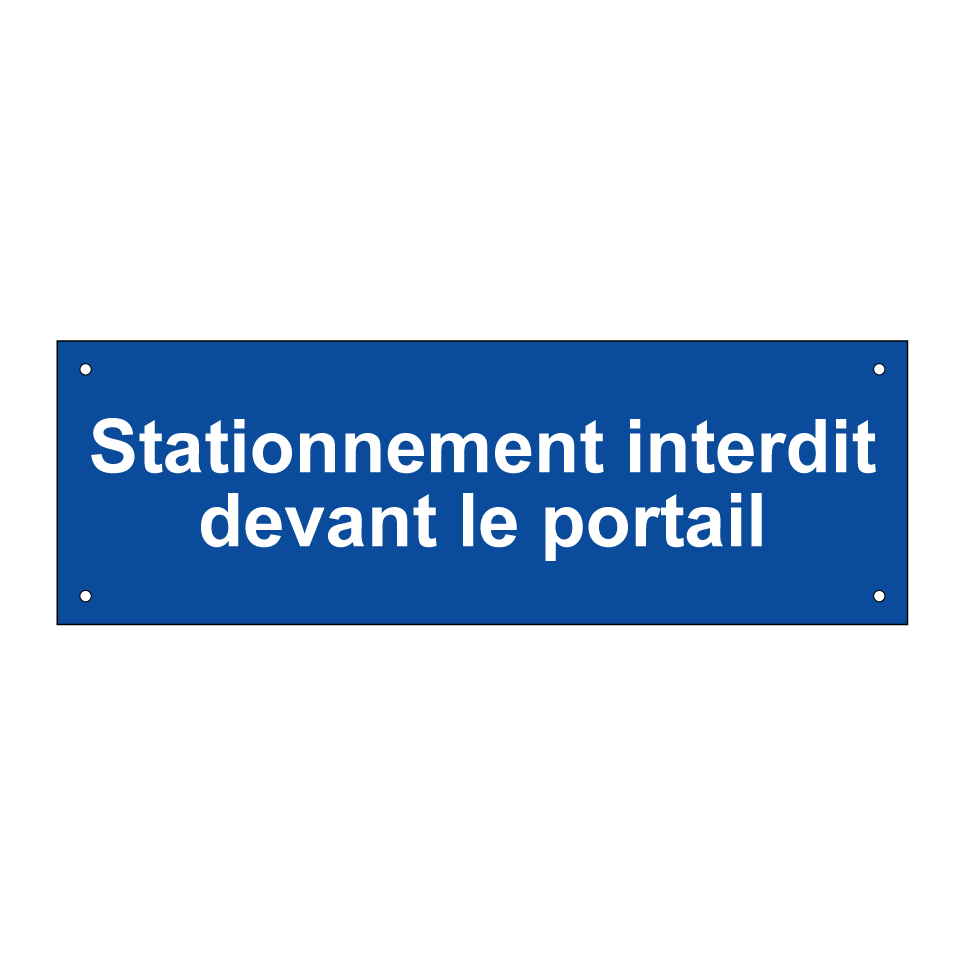 Panneau d'interdiction de stationner avec le texte : "Stationnement interdit devant le portail".