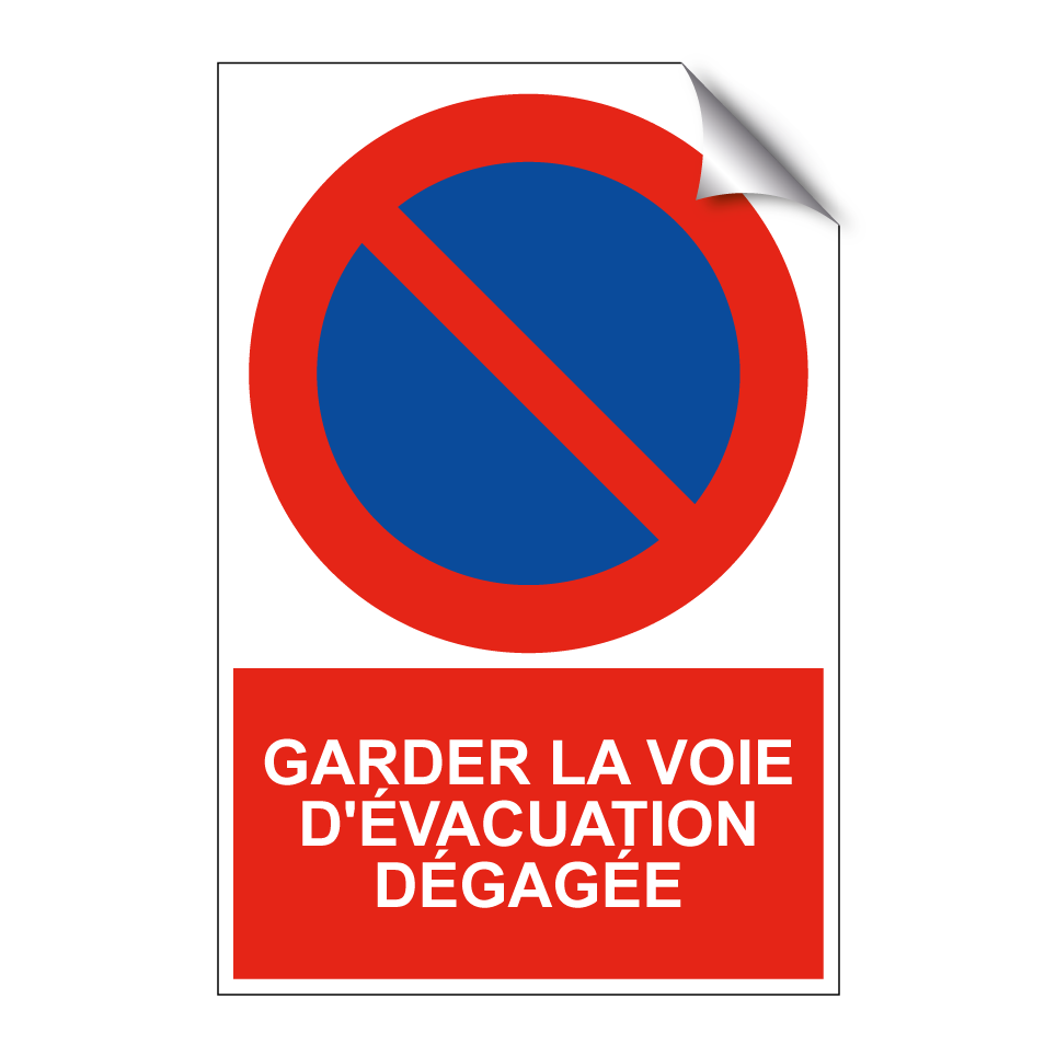 Panneau d'interdiction de stationner avec le texte : "Garder la voie d'évacuation dégagée" et une symbolique claire.