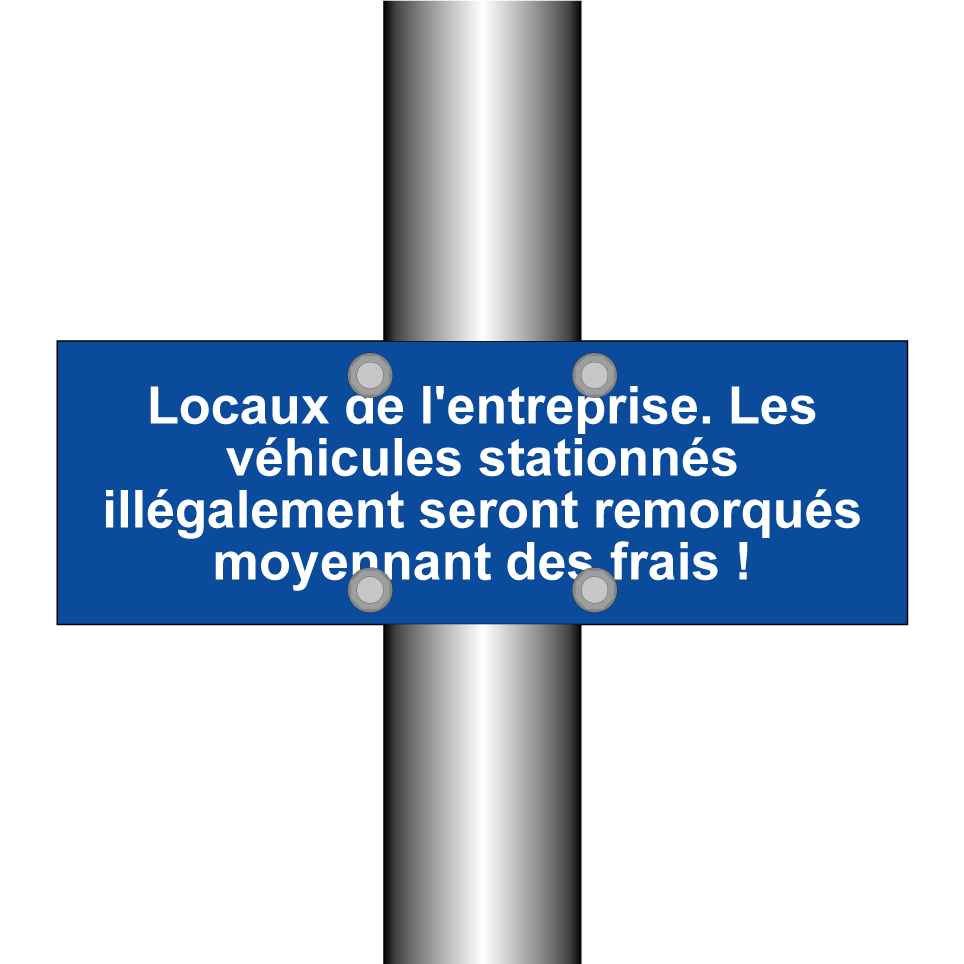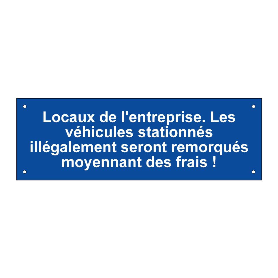 Panneau d'interdiction de stationner avec le texte : "Locaux de l'entreprise. Les véhicules stationnés illégalement seront remorqués moyennant des frais !".