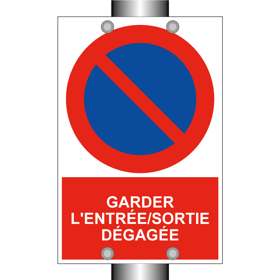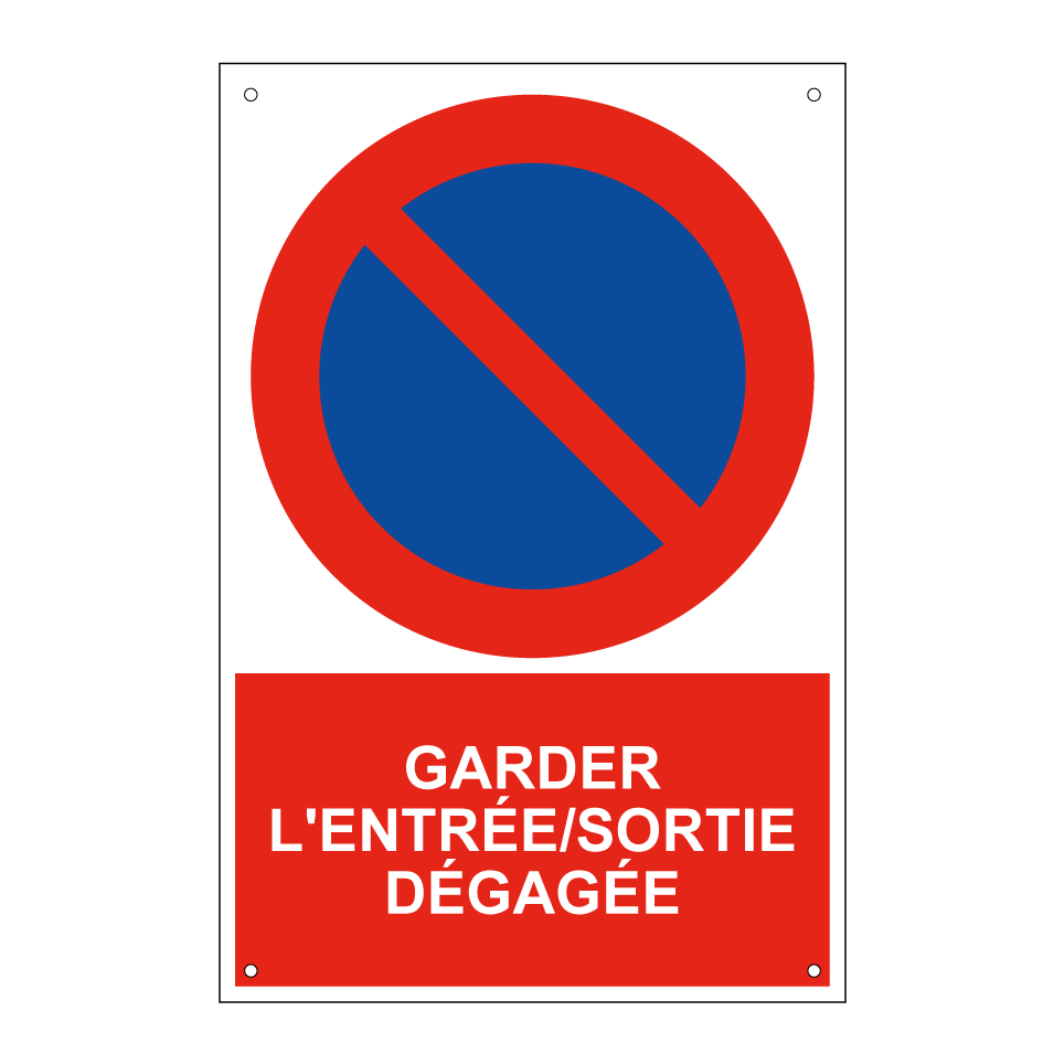 Panneau d'interdiction de stationner avec le texte : "Garder l'entrée/sortie dégagée" et une symbolique claire.