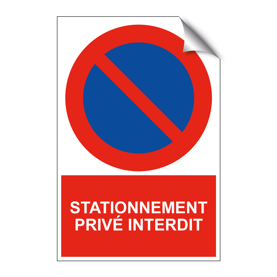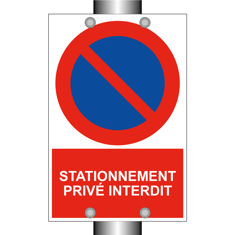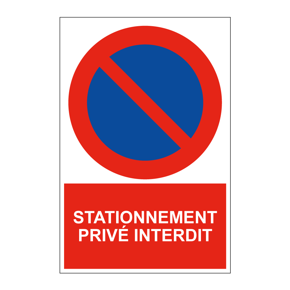 Panneau d'interdiction de stationner avec le texte : "Stationnement privé interdit" et une symbolique claire.