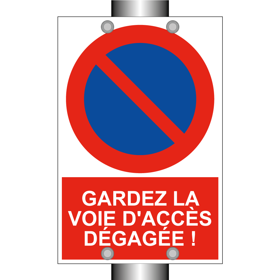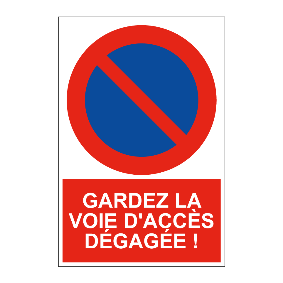 Panneau d'interdiction de stationner avec le texte : "Gardez la voie d'accès dégagée !" et une symbolique claire.