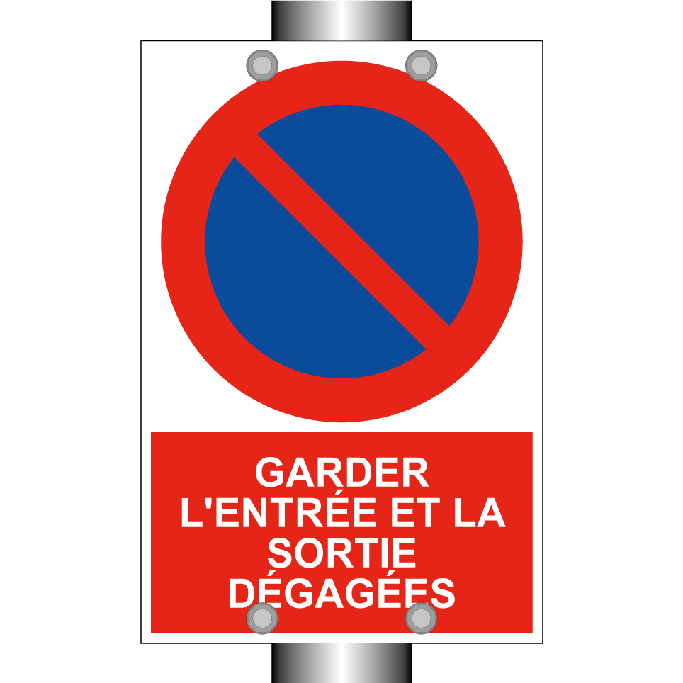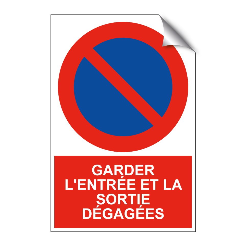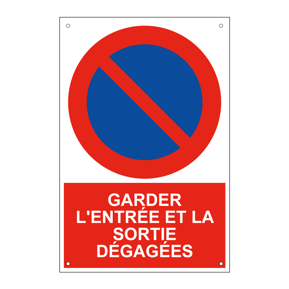 Panneau d'interdiction de stationner avec le texte : "Garder l'entrée et la sortie dégagées" et une symbolique claire.