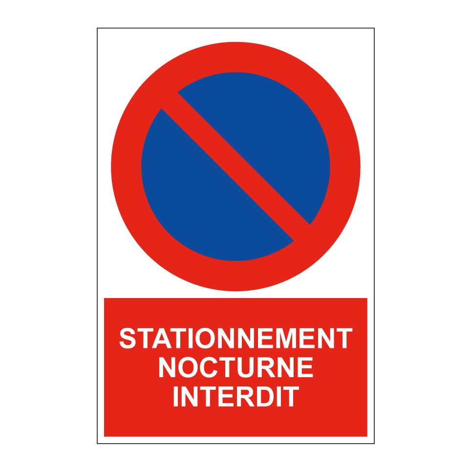 Panneau d'interdiction de stationner avec le texte : "Stationnement nocturne interdit" et une symbolique claire.