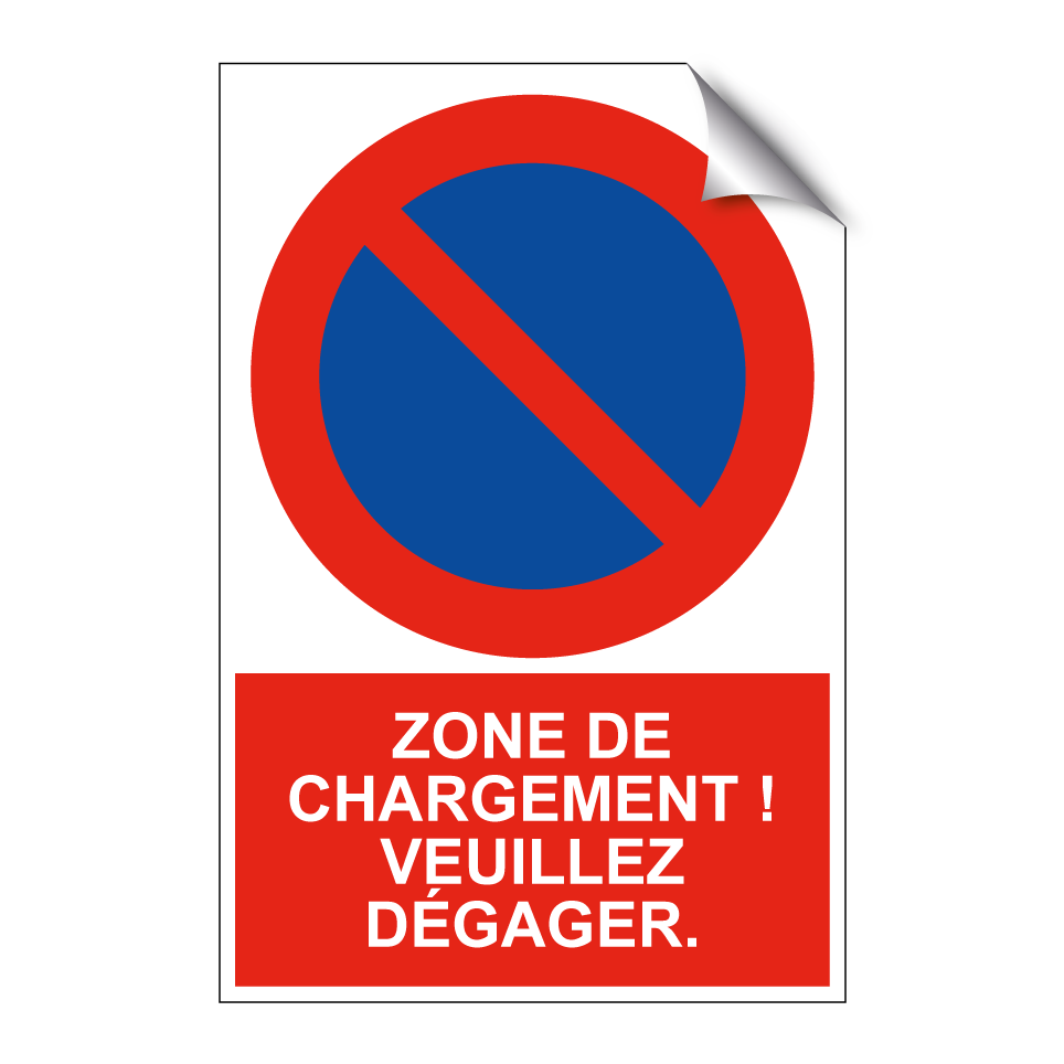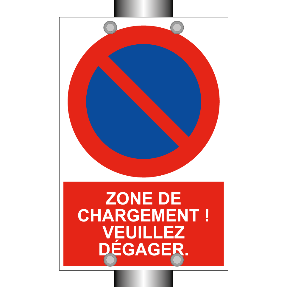 Panneau d'interdiction de stationner avec le texte : "Zone de chargement ! Veuillez dégager." et une symbolique claire.
