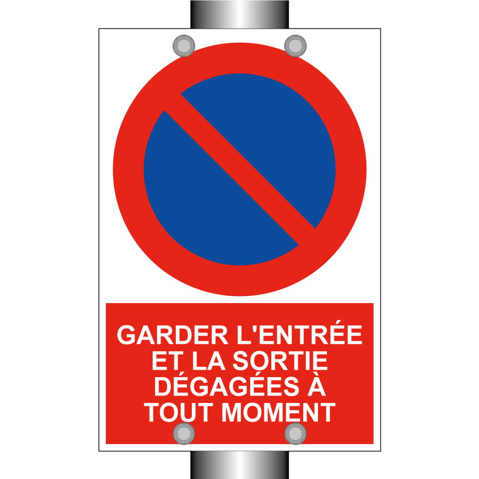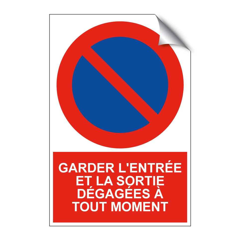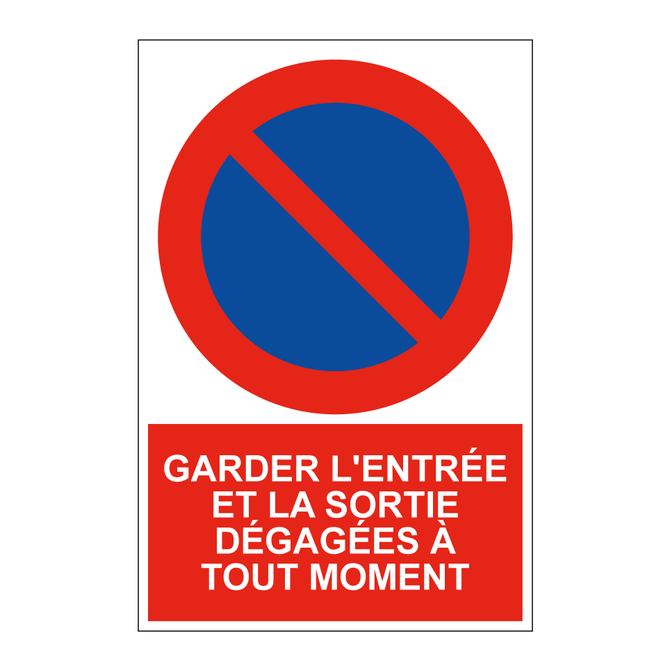 Panneau d'interdiction de stationner avec le texte : "Garder l'entrée et la sortie dégagées à tout moment" et une symbolique claire.