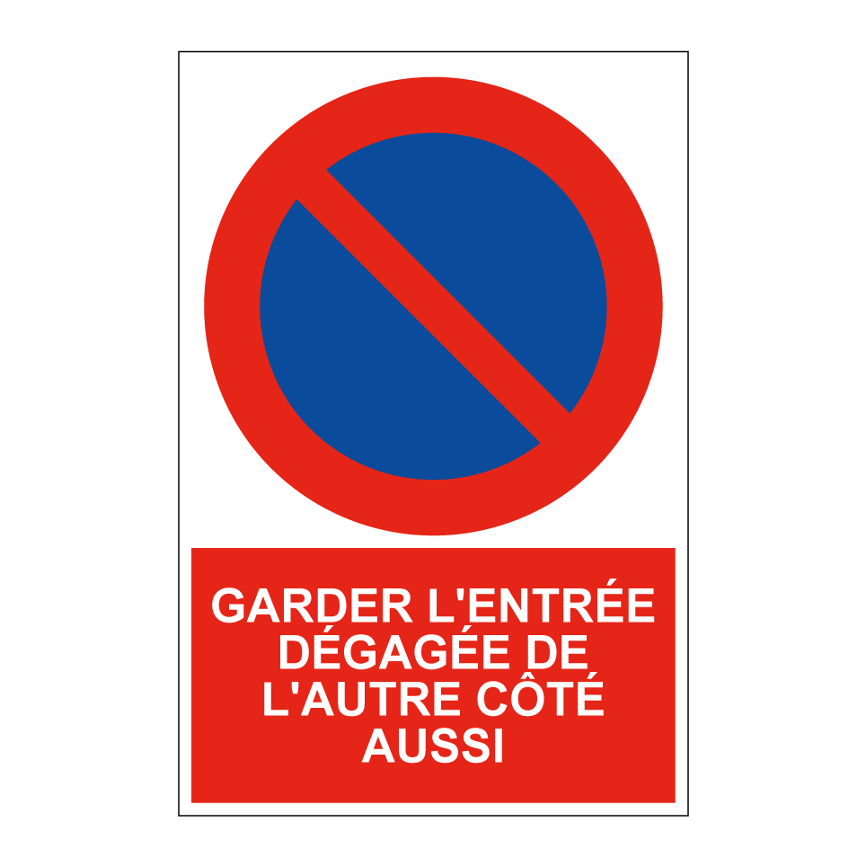 Panneau d'interdiction de stationner avec le texte : "Garder l'entrée dégagée de l'autre côté aussi" et une symbolique claire.