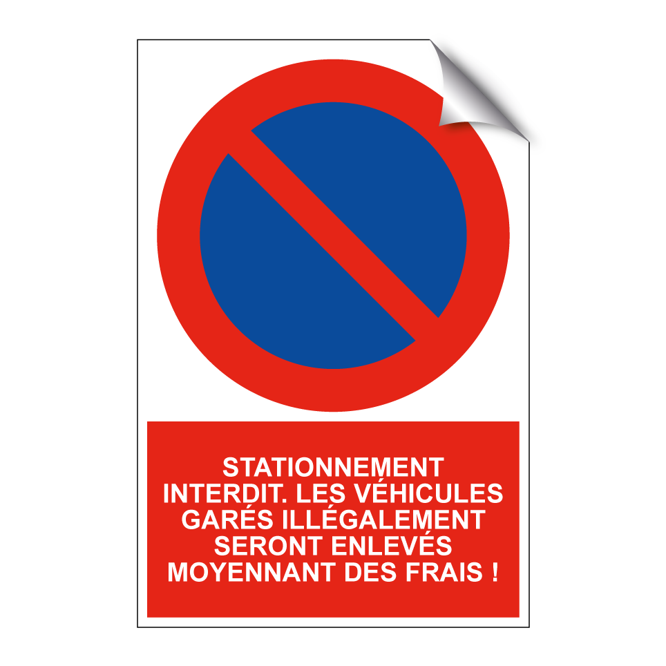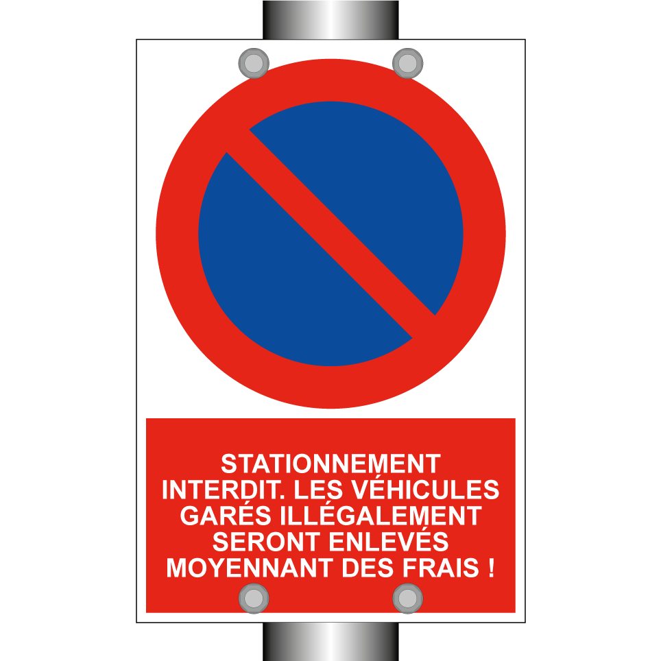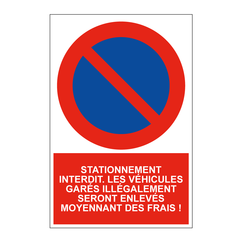 Panneau d'interdiction de stationner avec le texte : "Stationnement interdit. Les véhicules garés illégalement seront enlevés moyennant des frais !" et une symbolique claire.