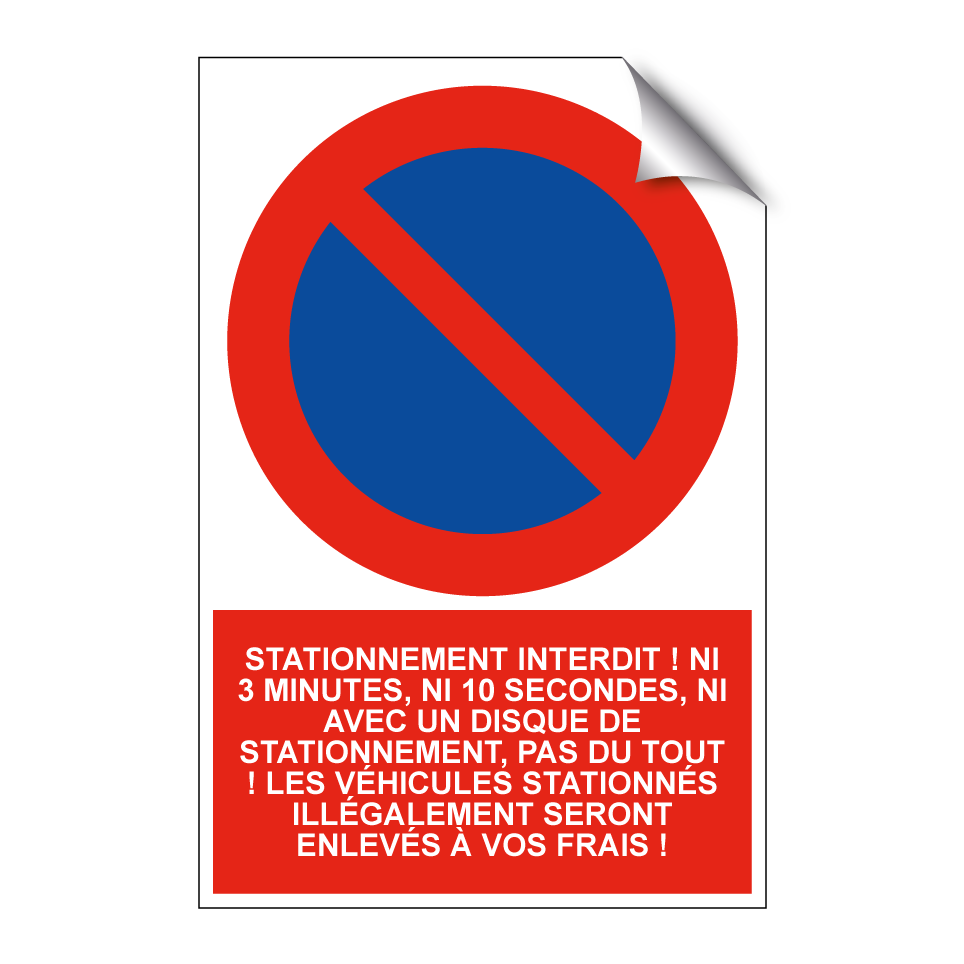 Panneau d'interdiction de stationner avec le texte : "Stationnement interdit ! Ni 3 minutes, ni 10 secondes, ni avec un disque de stationnement, pas du tout ! Les véhicules stationnés illégalement seront enlevés à vos frais !" et une symbolique claire.