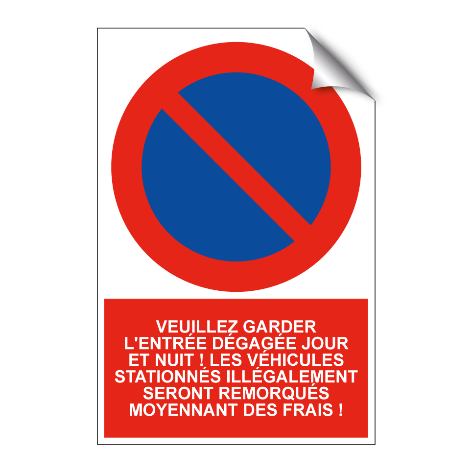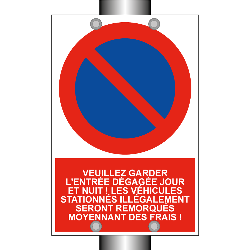 Panneau d'interdiction de stationner avec le texte : "Veuillez garder l'entrée dégagée jour et nuit ! Les véhicules stationnés illégalement seront remorqués moyennant des frais !" et une symbolique claire.