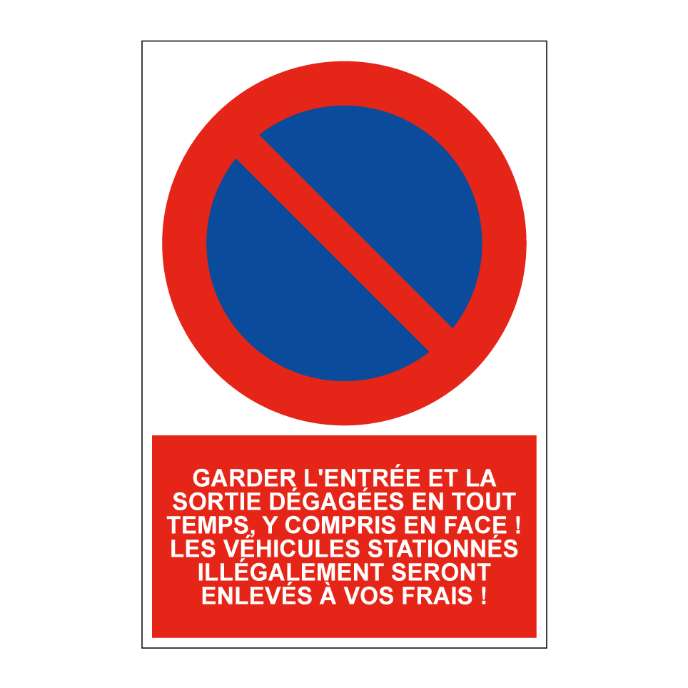 Panneau d'interdiction de stationner avec le texte : "Garder l'entrée et la sortie dégagées en tout temps, y compris en face ! Les véhicules stationnés illégalement seront enlevés à vos frais !" et une symbolique claire.