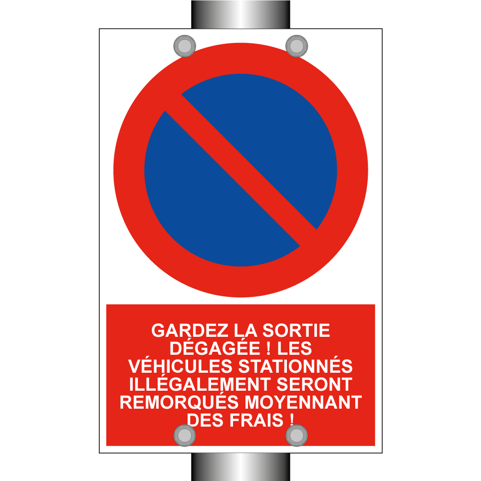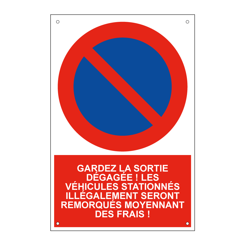Panneau d'interdiction de stationner avec le texte : "Gardez la sortie dégagée ! Les véhicules stationnés illégalement seront remorqués moyennant des frais !" et une symbolique claire.