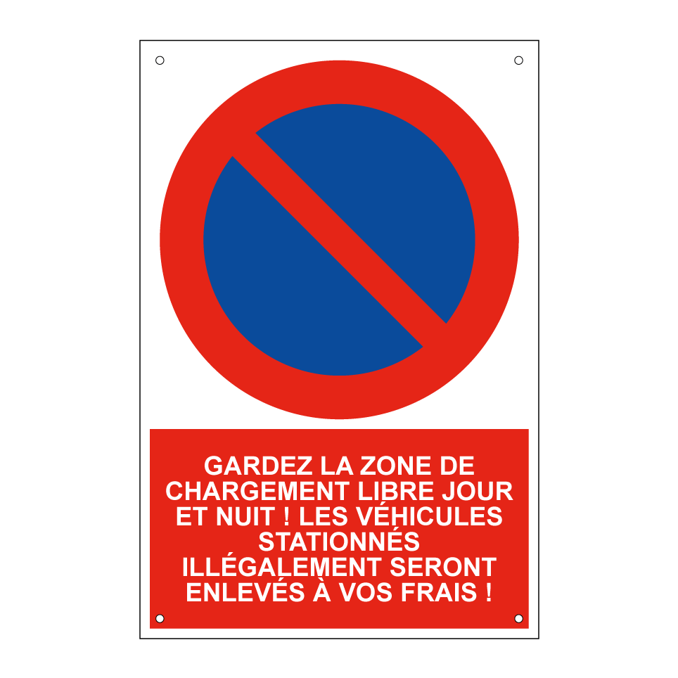 Panneau d'interdiction de stationner avec le texte : "Gardez la zone de chargement libre jour et nuit ! Les véhicules stationnés illégalement seront enlevés à vos frais !" et une symbolique claire.