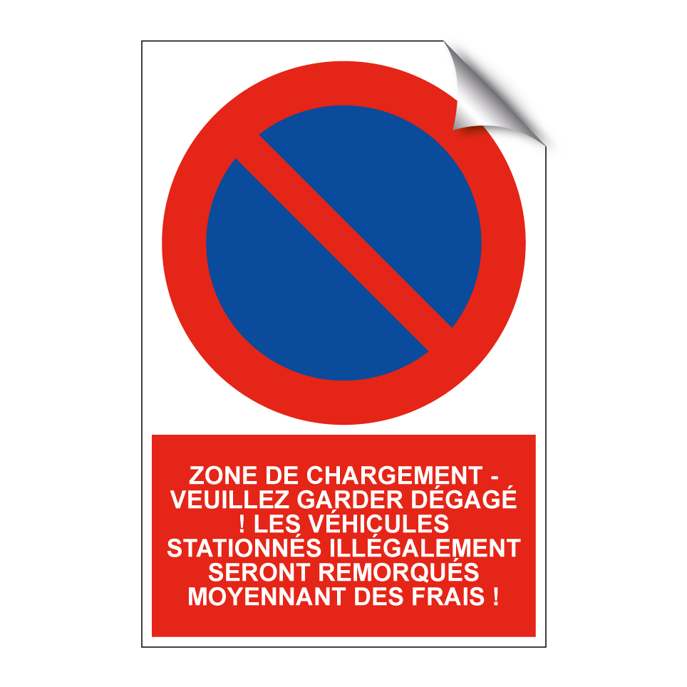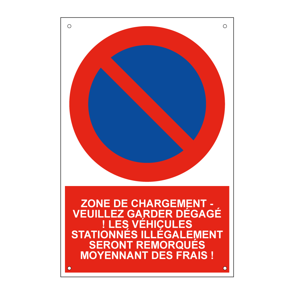 Panneau d'interdiction de stationner avec le texte : "Zone de chargement - veuillez garder dégagé ! Les véhicules stationnés illégalement seront remorqués moyennant des frais !" et une symbolique claire.
