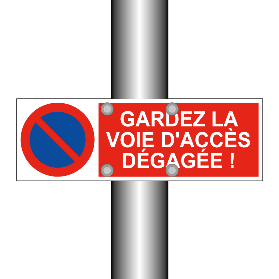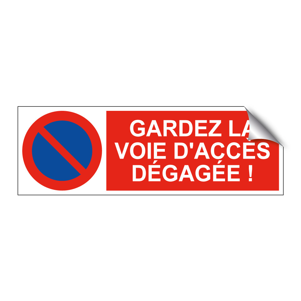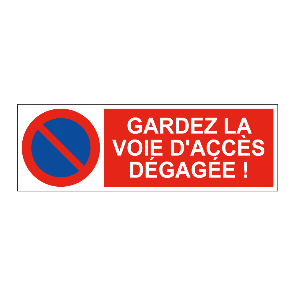 Panneau d'interdiction de stationner avec le texte : "Gardez la voie d'accès dégagée !" et une symbolique claire.