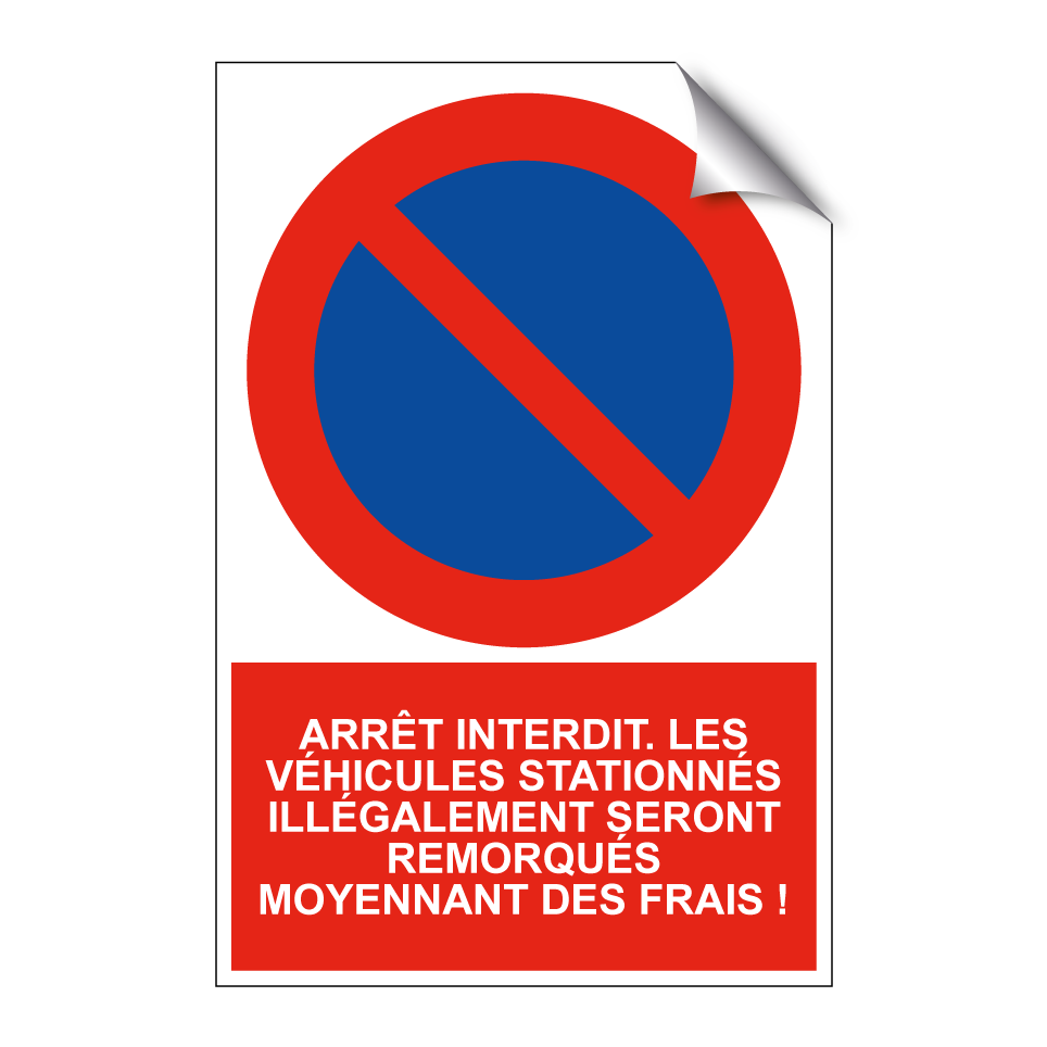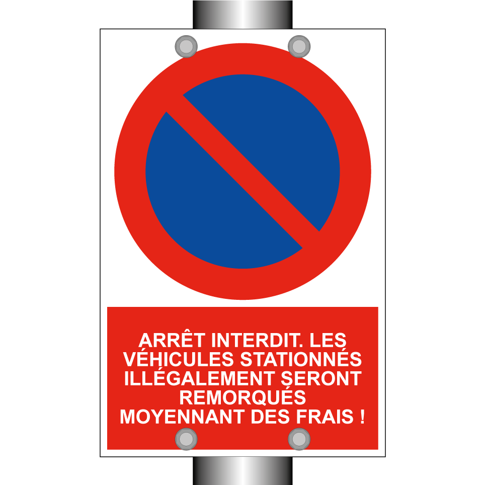 Panneau d'interdiction de stationner avec le texte : "Arrêt interdit. Les véhicules stationnés illégalement seront remorqués moyennant des frais !" et une symbolique claire.