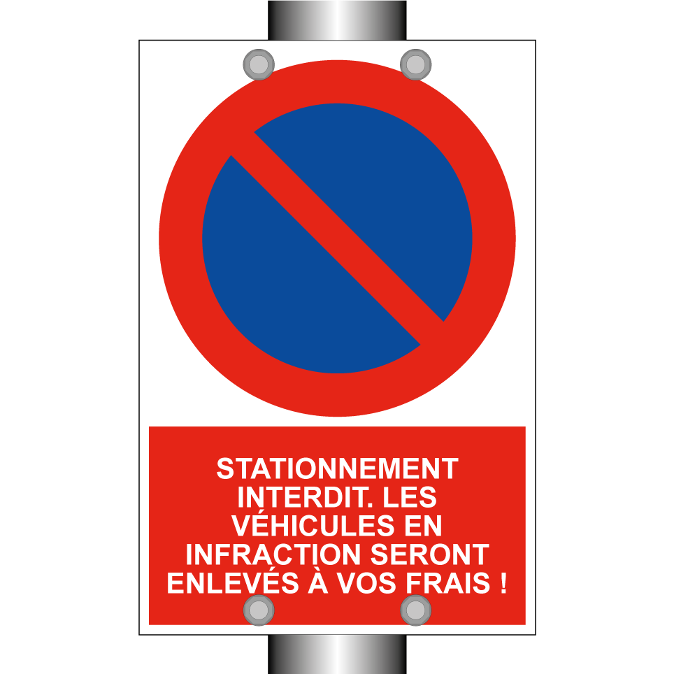 Panneau d'interdiction de stationner avec le texte : "Stationnement interdit. Les véhicules en infraction seront enlevés à vos frais !" et une symbolique claire.