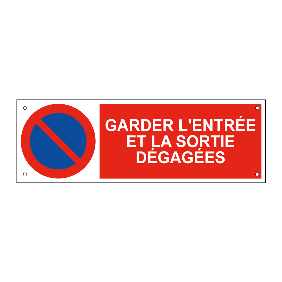 Panneau d'interdiction de stationner avec le texte : "Garder l'entrée et la sortie dégagées" et une symbolique claire.