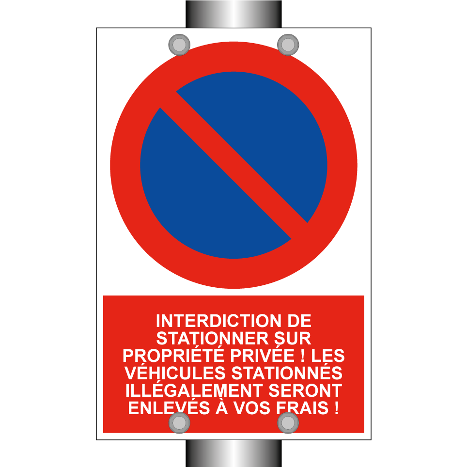 Panneau d'interdiction de stationner avec le texte : "Interdiction de stationner sur propriété privée ! Les véhicules stationnés illégalement seront enlevés à vos frais !" et une symbolique claire.