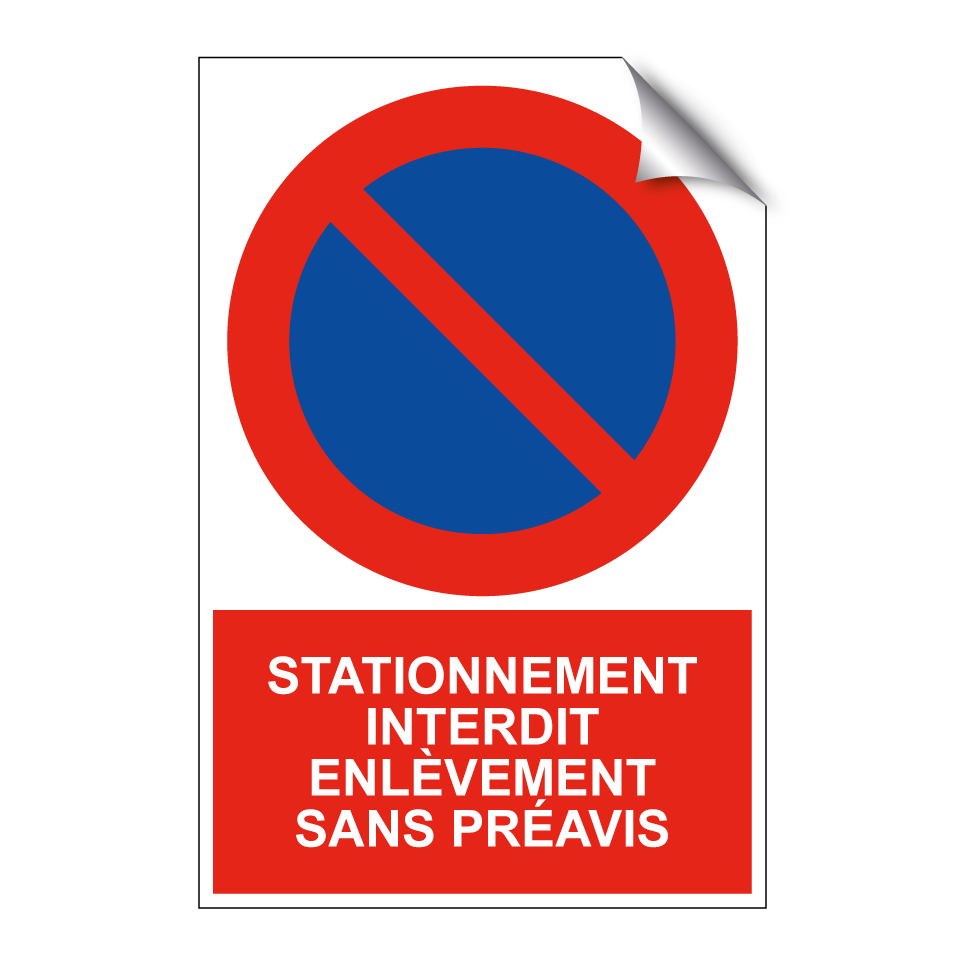 Panneau d'interdiction de stationner avec le texte : "Stationnement interdit enlèvement sans préavis" et une symbolique claire.