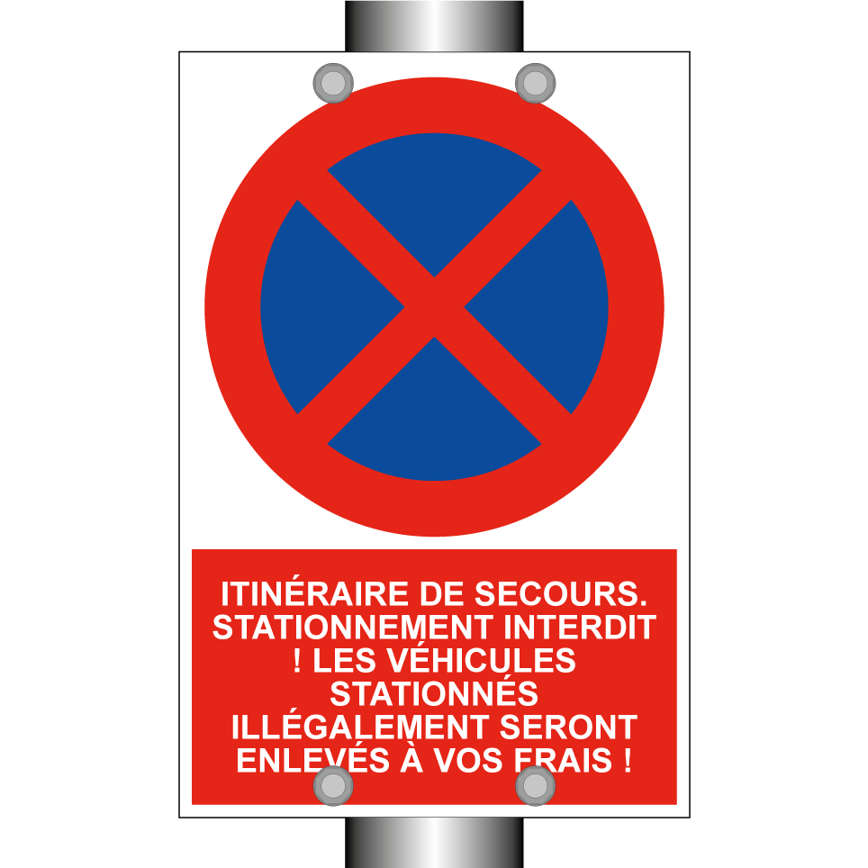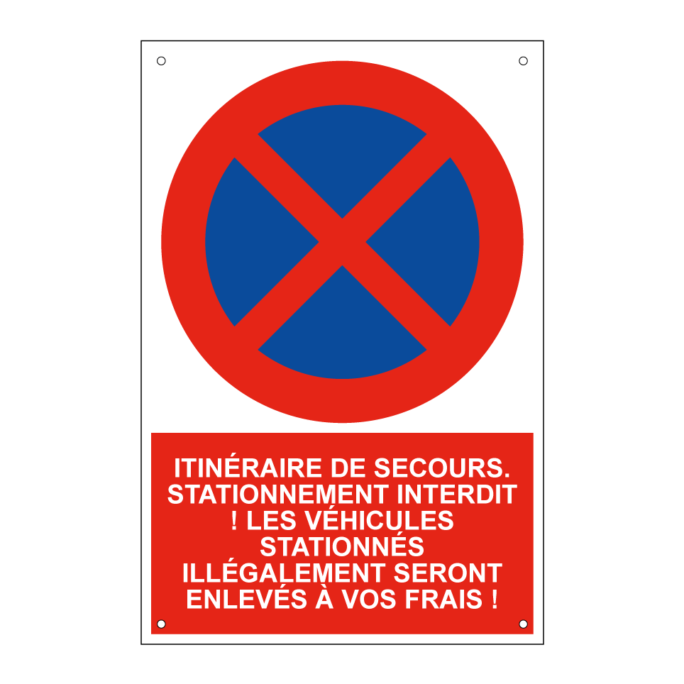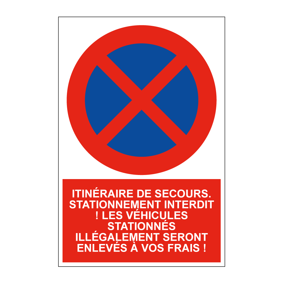 Panneau d'interdiction de stationner avec le texte : "Itinéraire de secours. Stationnement interdit ! Les véhicules stationnés illégalement seront enlevés à vos frais !" et une symbolique claire.