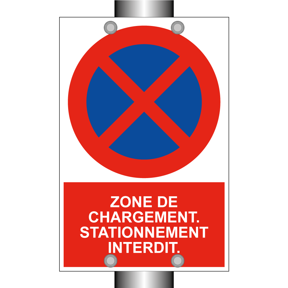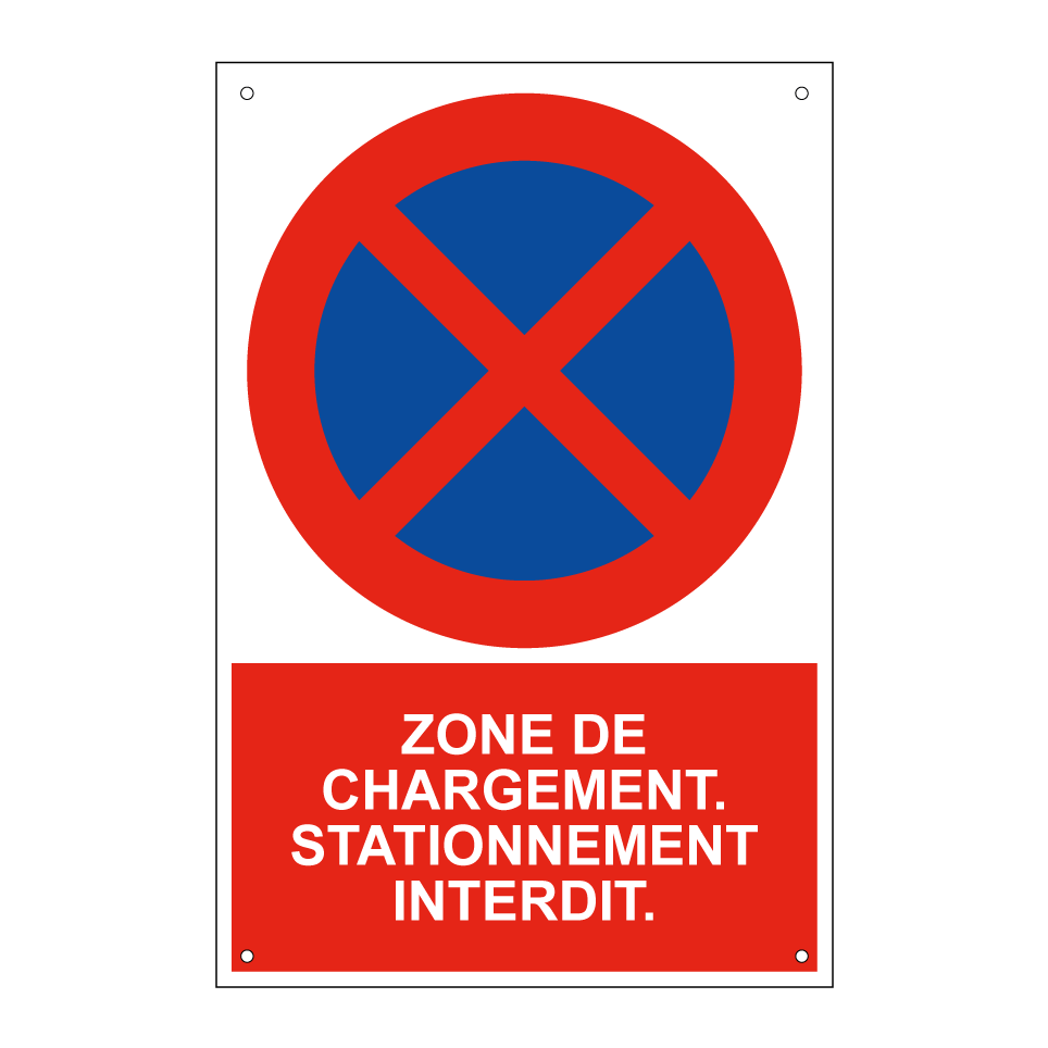 Panneau d'interdiction de stationner avec le texte : "Zone de chargement. Stationnement interdit." et une symbolique claire.
