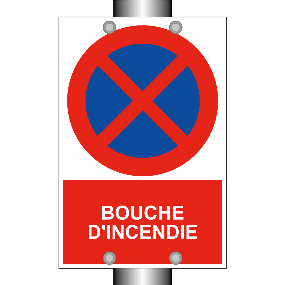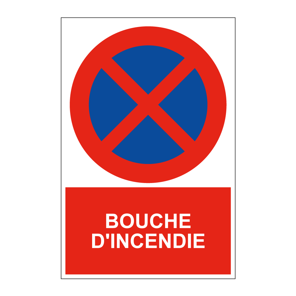 Panneau d'interdiction de stationner avec le texte : "Bouche d'incendie" et une symbolique claire.