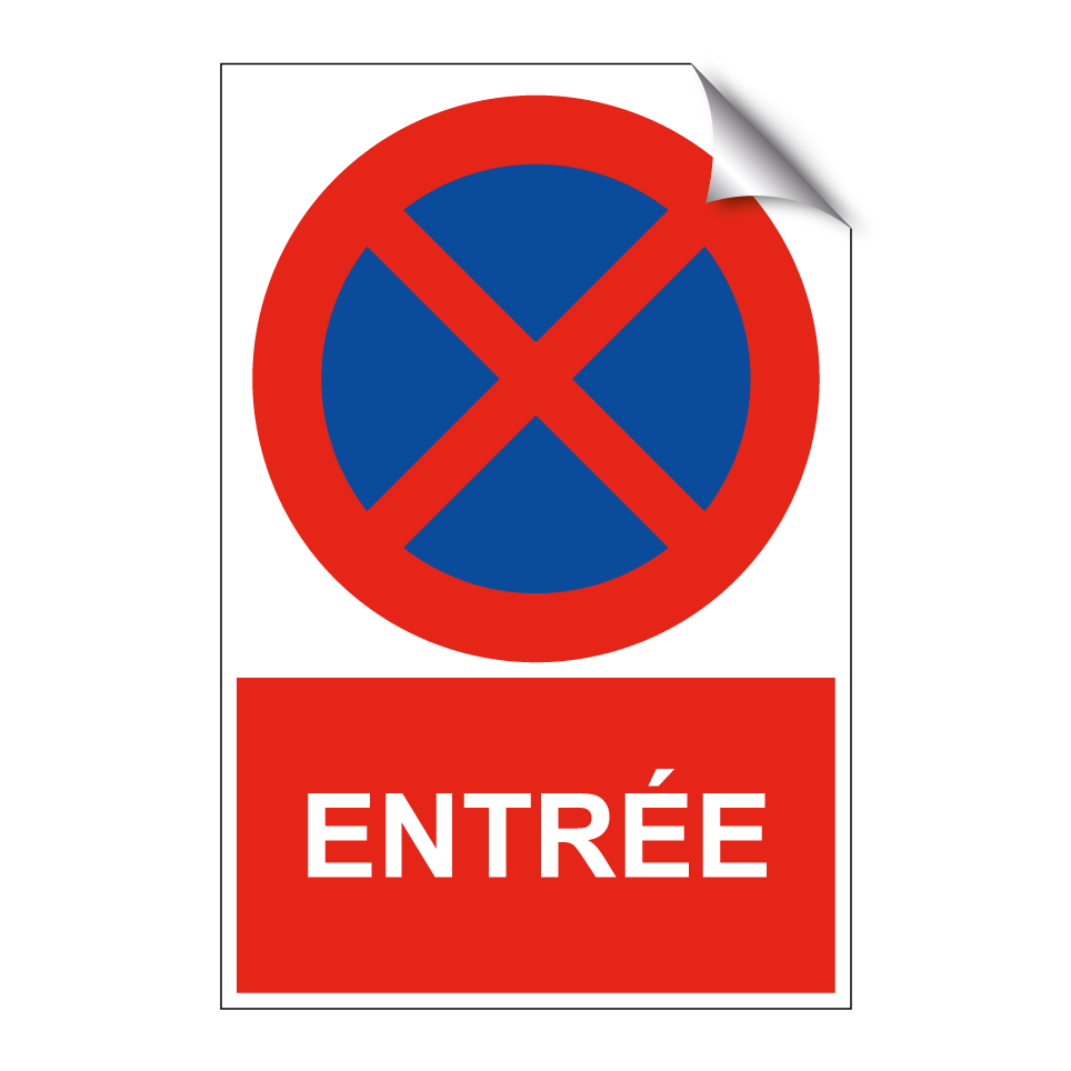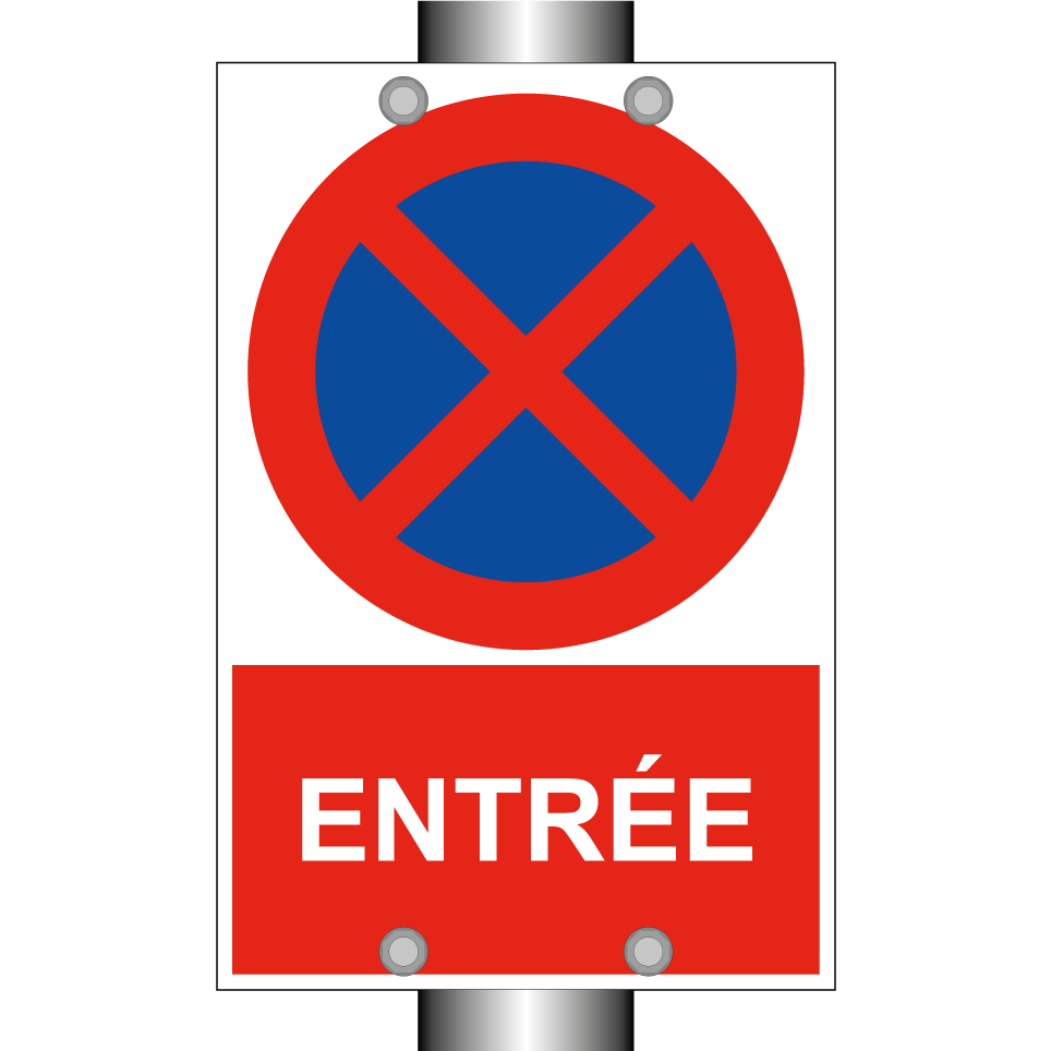 Panneau d'interdiction de stationner avec le texte : "Entrée" et une symbolique claire.