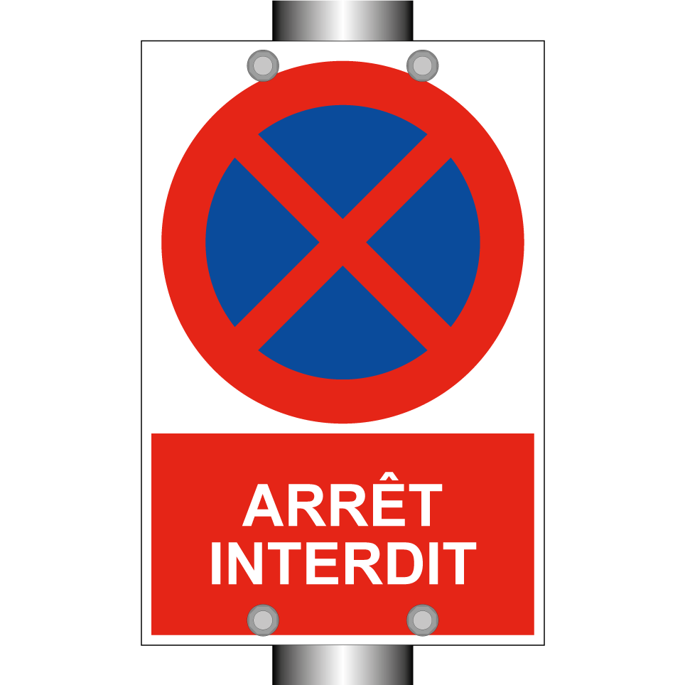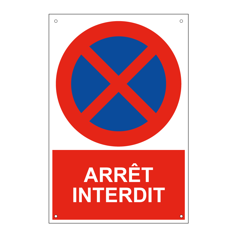 Panneau d'interdiction de stationner avec le texte : "Arrêt interdit" et une symbolique claire.
