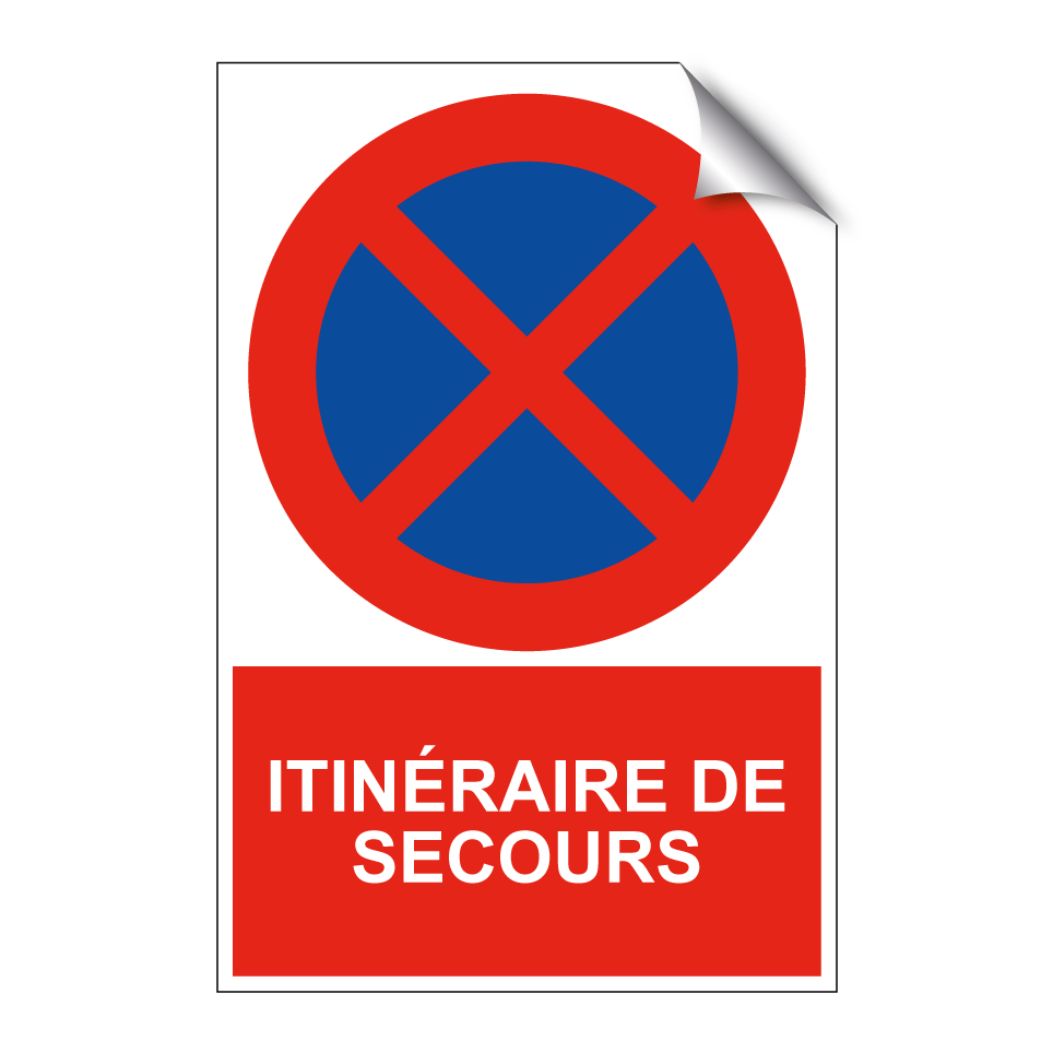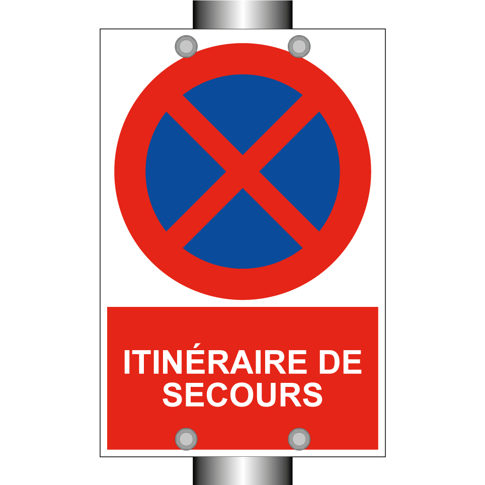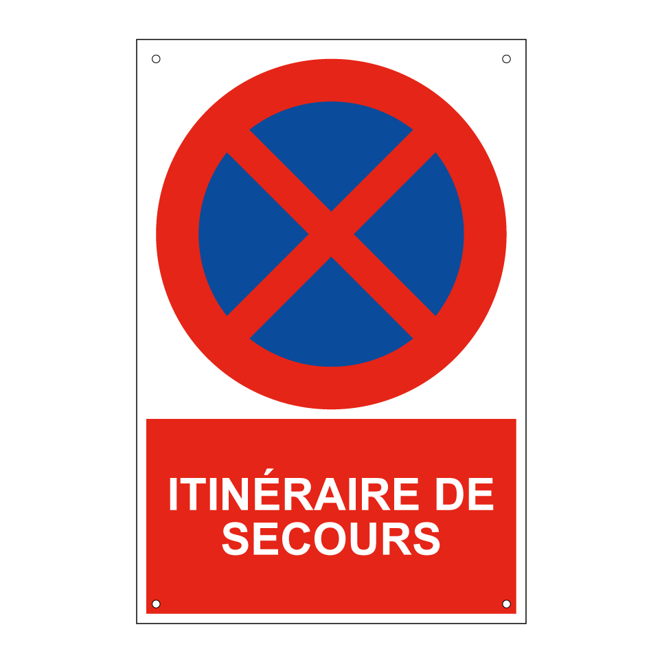 Panneau d'interdiction de stationner avec le texte : "Itinéraire de secours" et une symbolique claire.