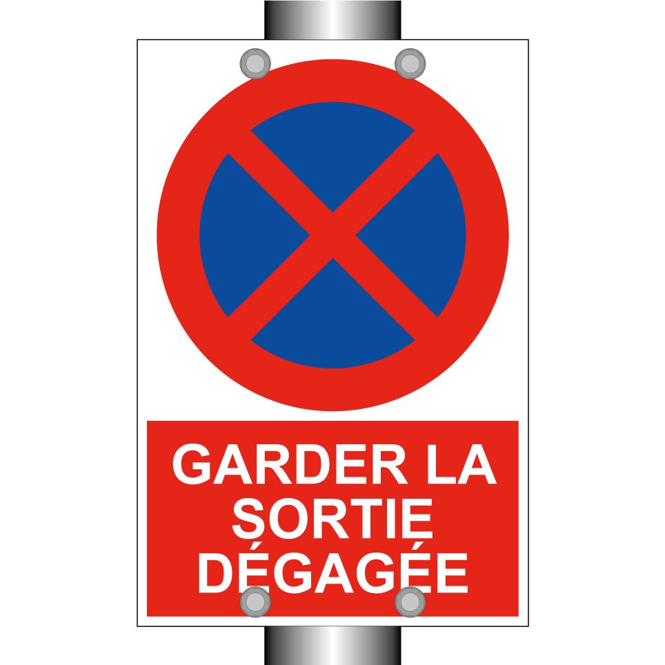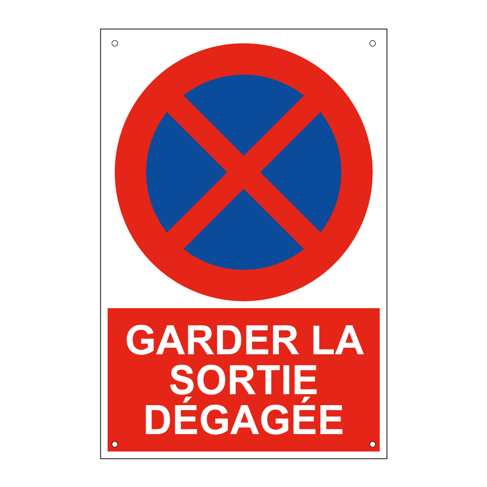 Panneau d'interdiction de stationner avec le texte : "Garder la sortie dégagée" et une symbolique claire.
