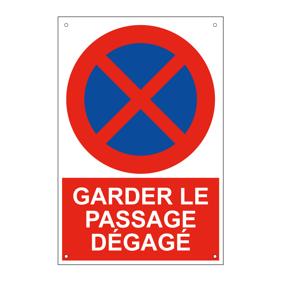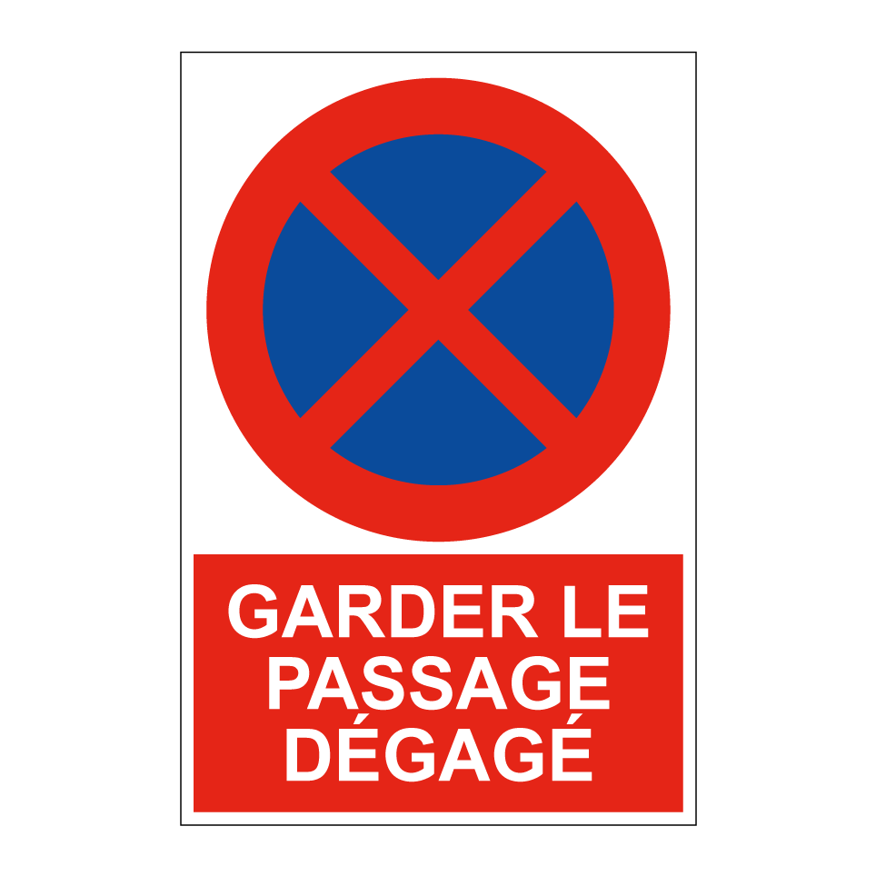 Panneau d'interdiction de stationner avec le texte : "Garder le passage dégagé" et une symbolique claire.