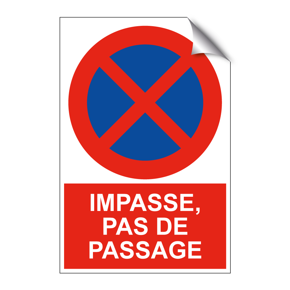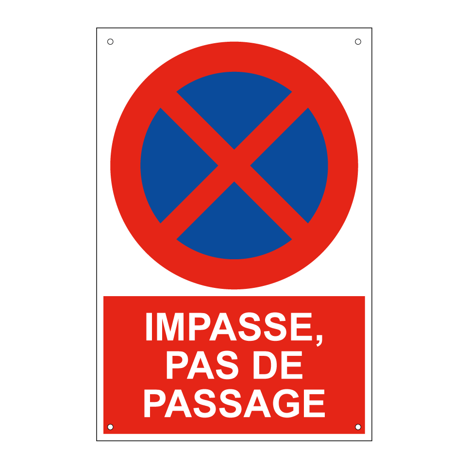 Panneau d'interdiction de stationner avec le texte : "Impasse, pas de passage" et une symbolique claire.