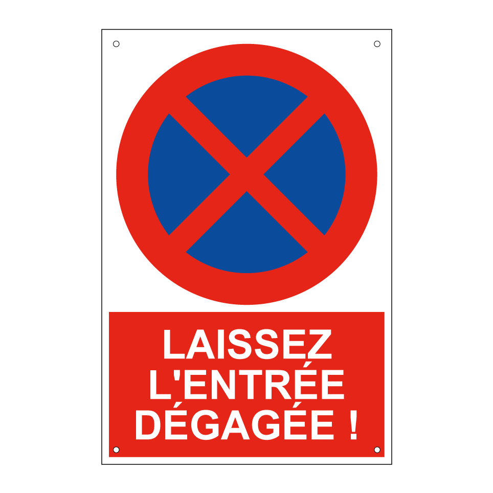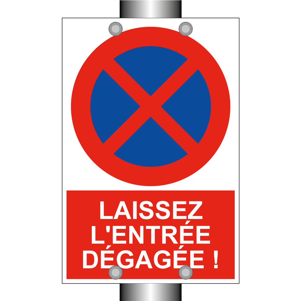 Panneau d'interdiction de stationner avec le texte : "Laissez l'entrée dégagée !" et une symbolique claire.