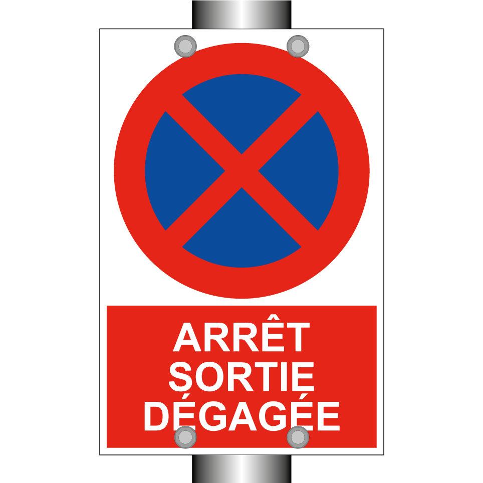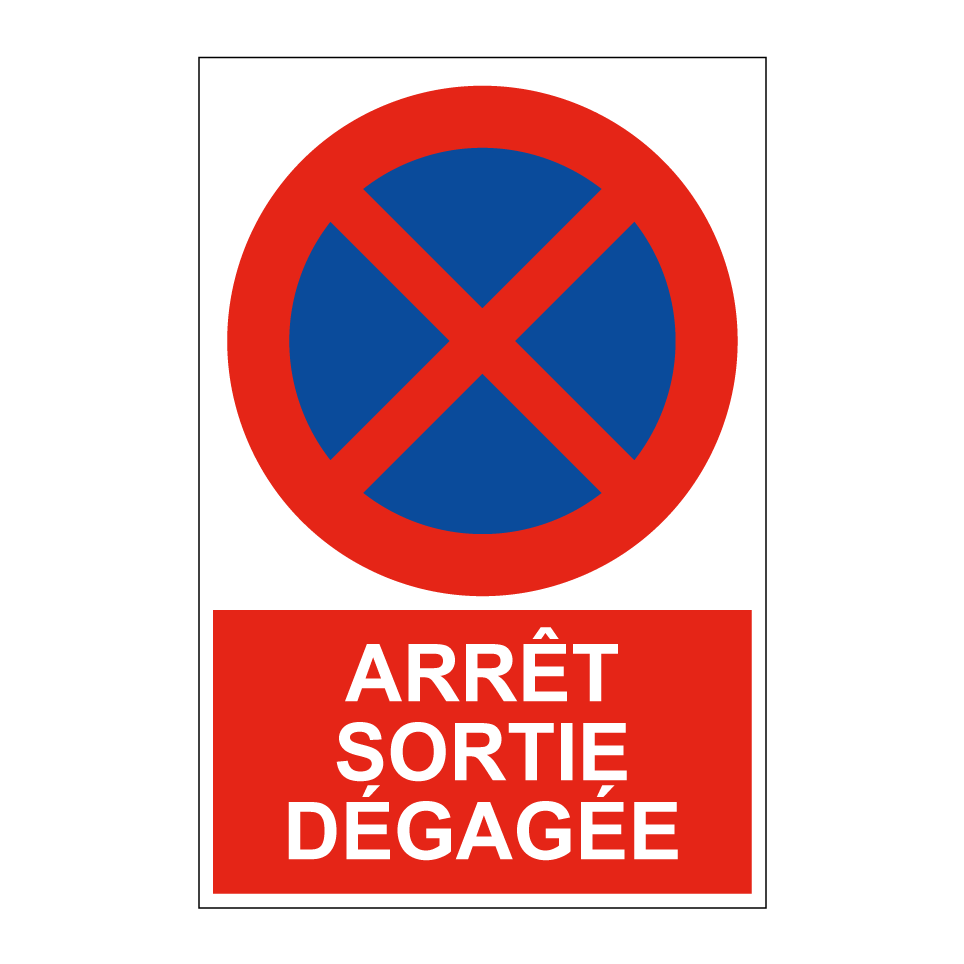 Panneau d'interdiction de stationner avec le texte : "Arrêt Sortie dégagée" et une symbolique claire.