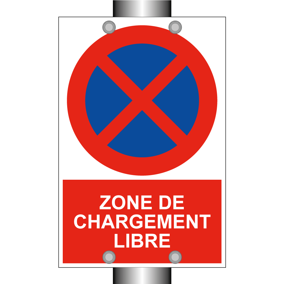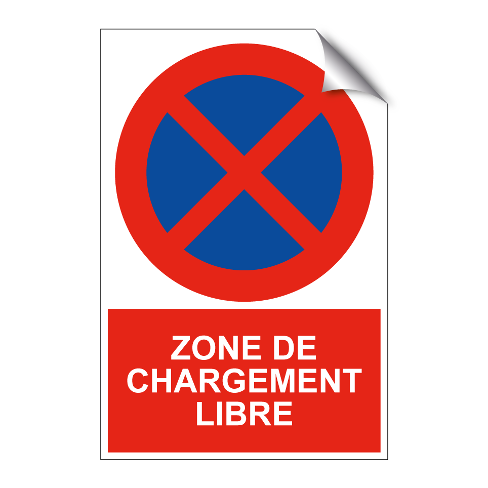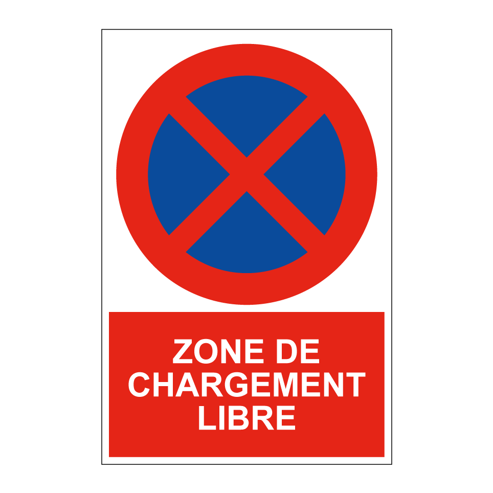 Panneau d'interdiction de stationner avec le texte : "Zone de chargement libre" et une symbolique claire.