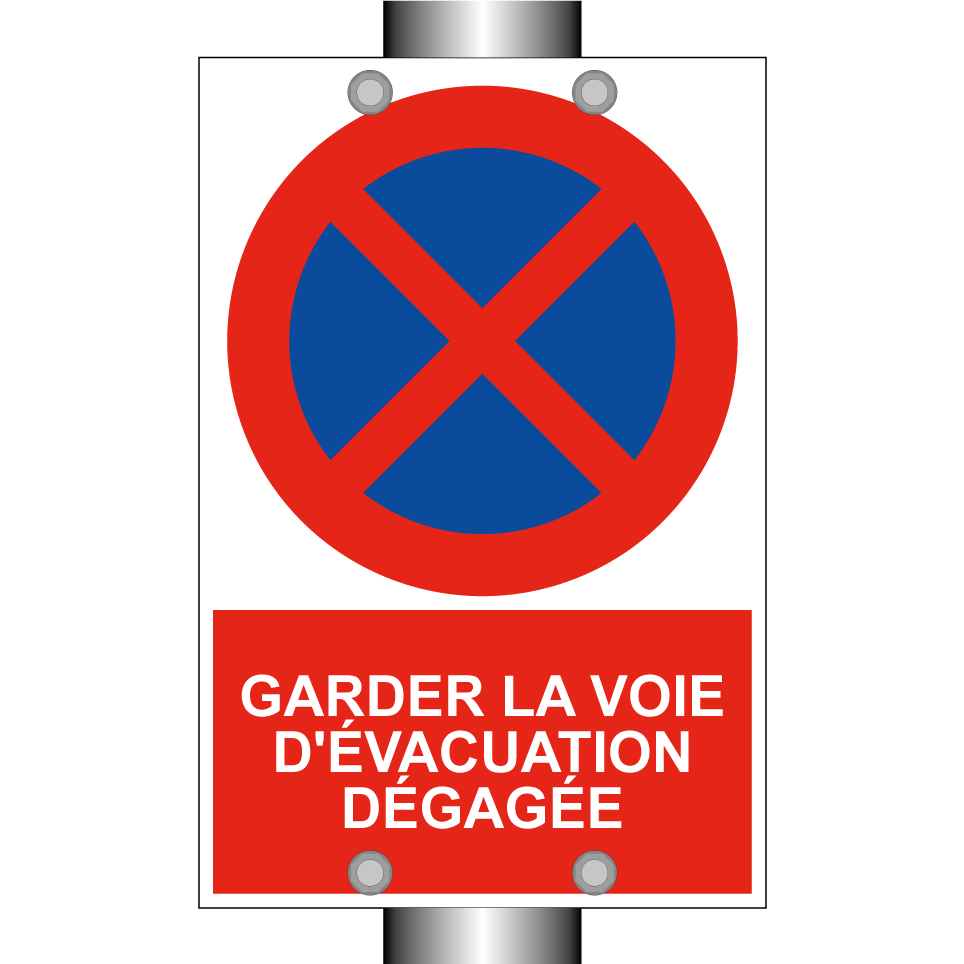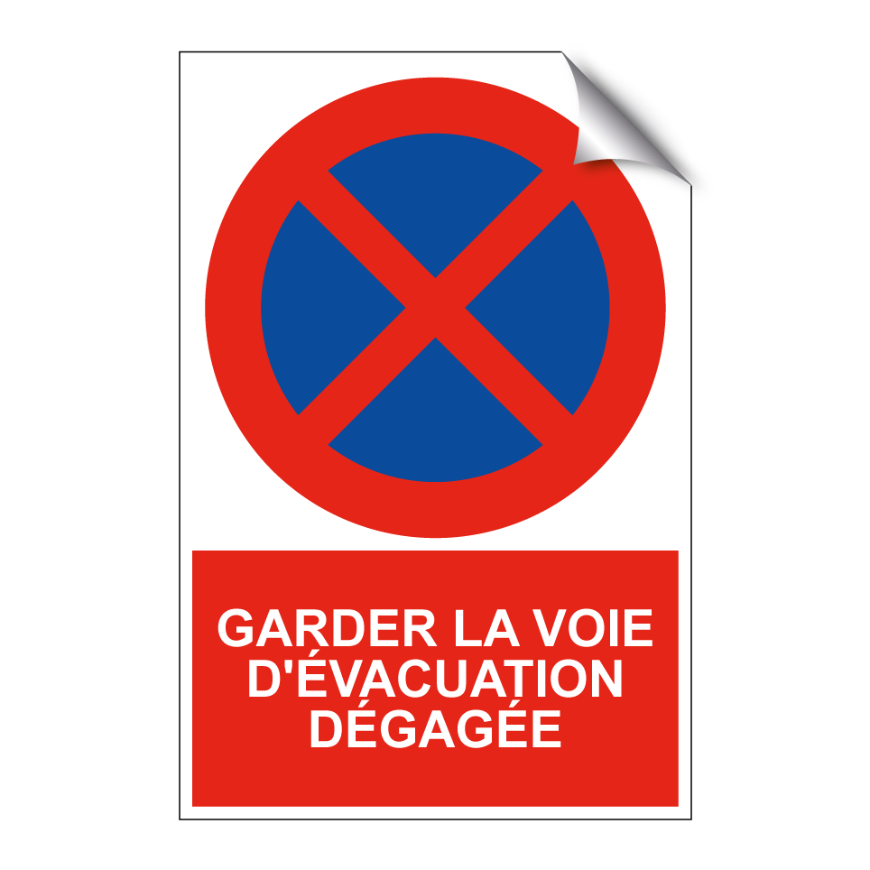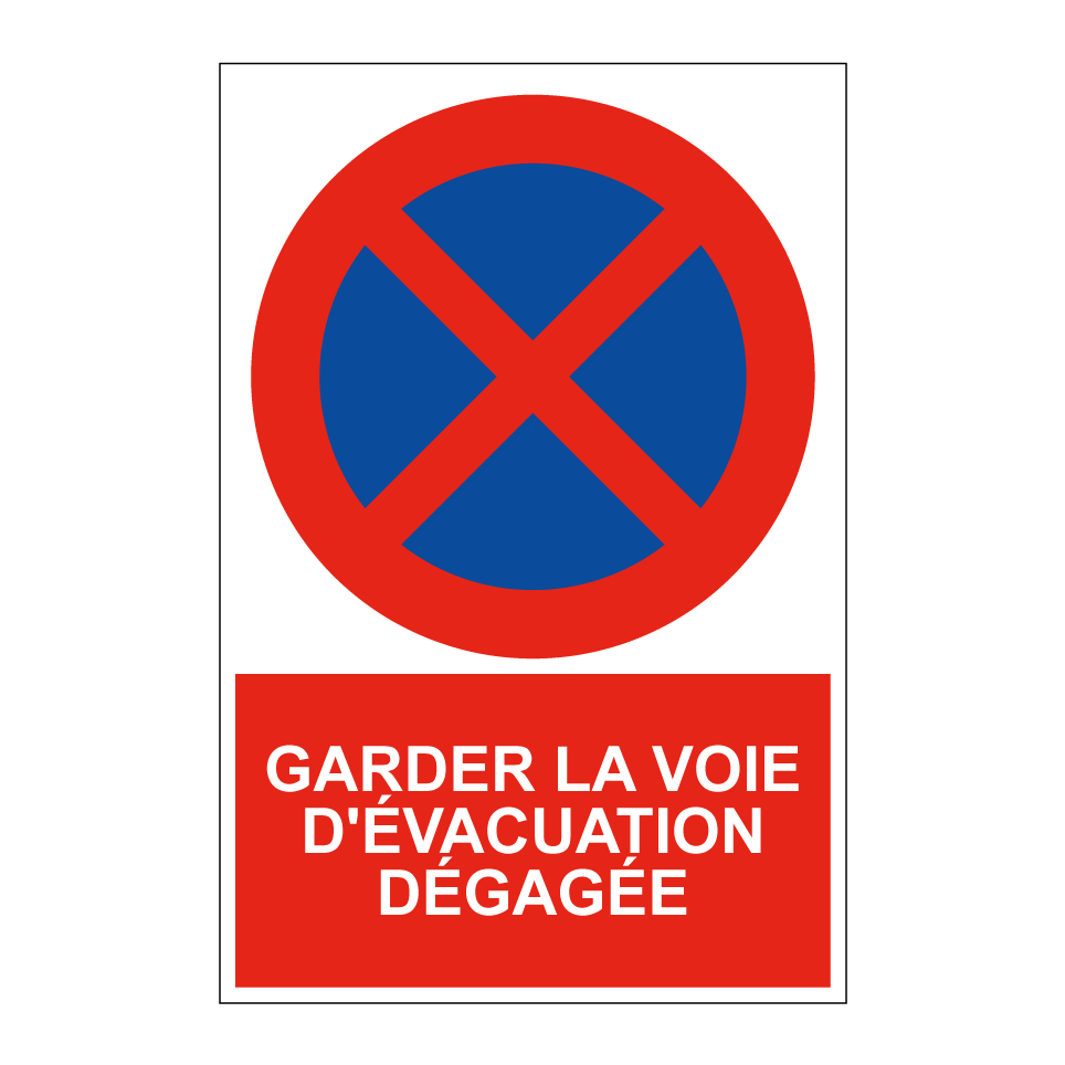 Panneau d'interdiction de stationner avec le texte : "Garder la voie d'évacuation dégagée" et une symbolique claire.
