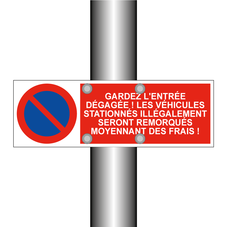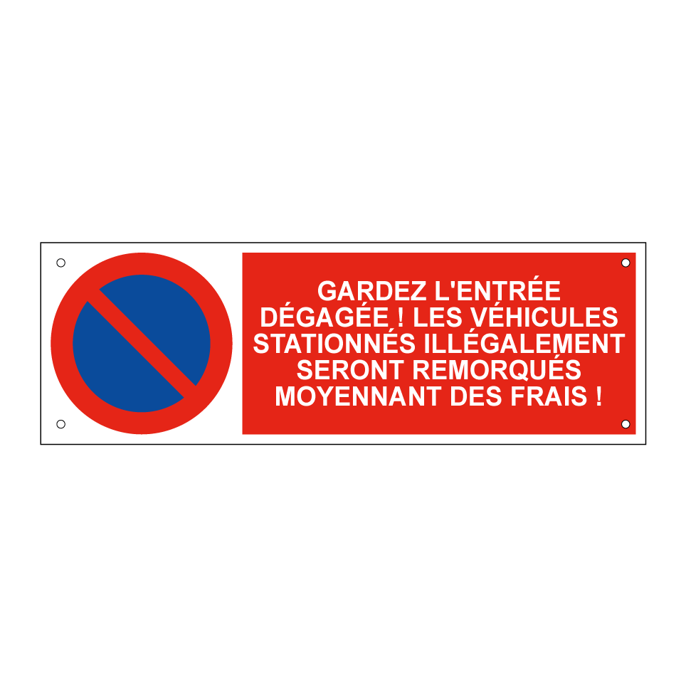 Panneau d'interdiction de stationner avec le texte : "Gardez l'entrée dégagée ! Les véhicules stationnés illégalement seront remorqués moyennant des frais !" et une symbolique claire.