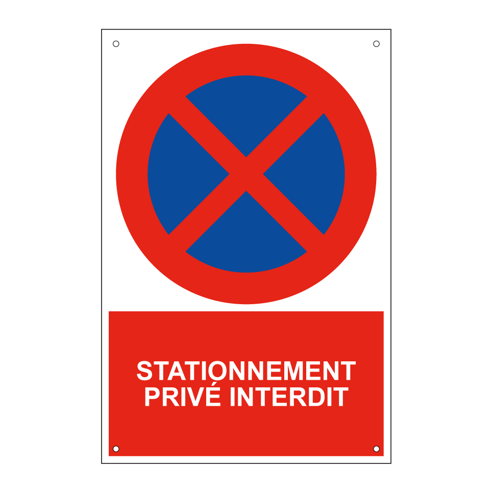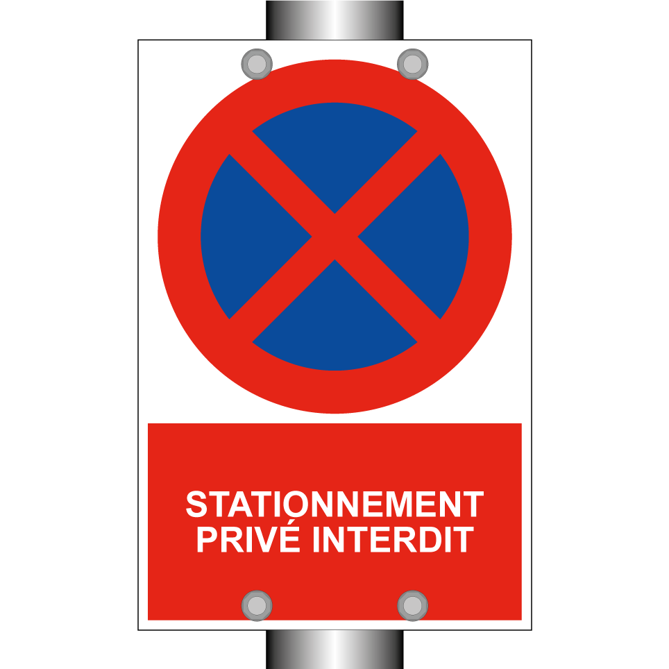 Panneau d'interdiction de stationner avec le texte : "Stationnement privé interdit" et une symbolique claire.