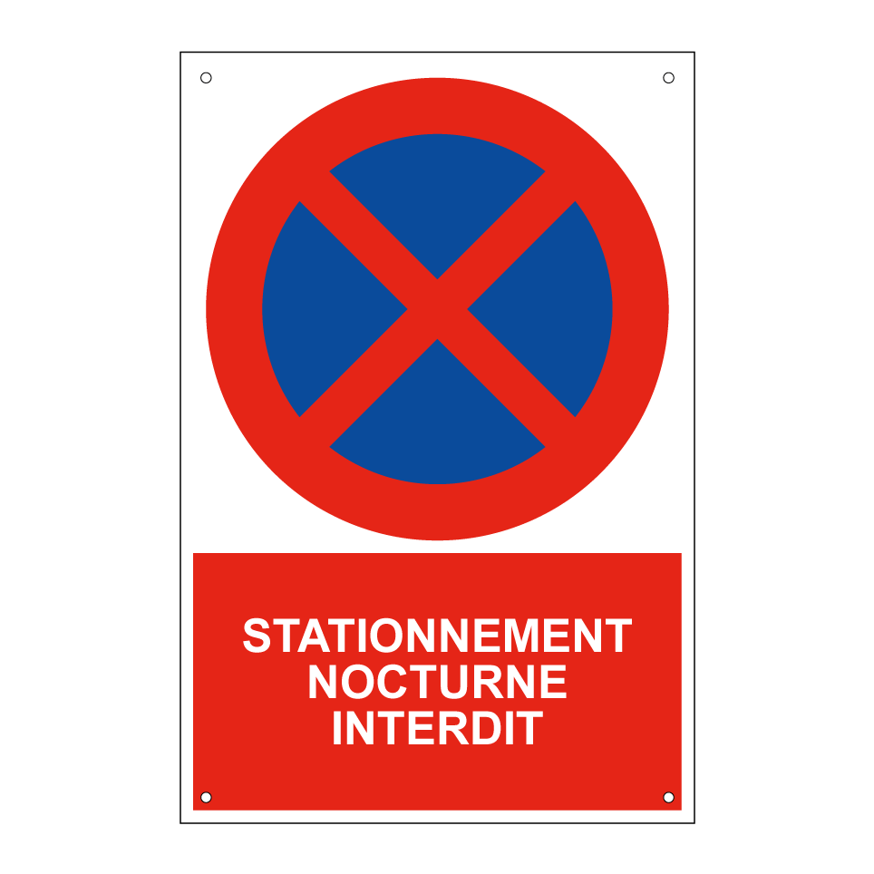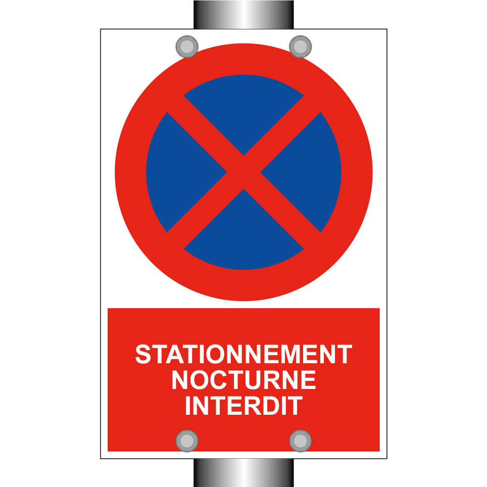 Panneau d'interdiction de stationner avec le texte : "Stationnement nocturne interdit" et une symbolique claire.