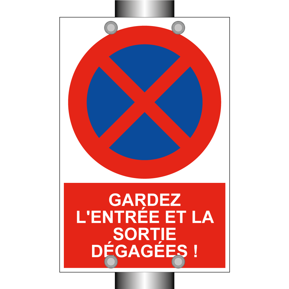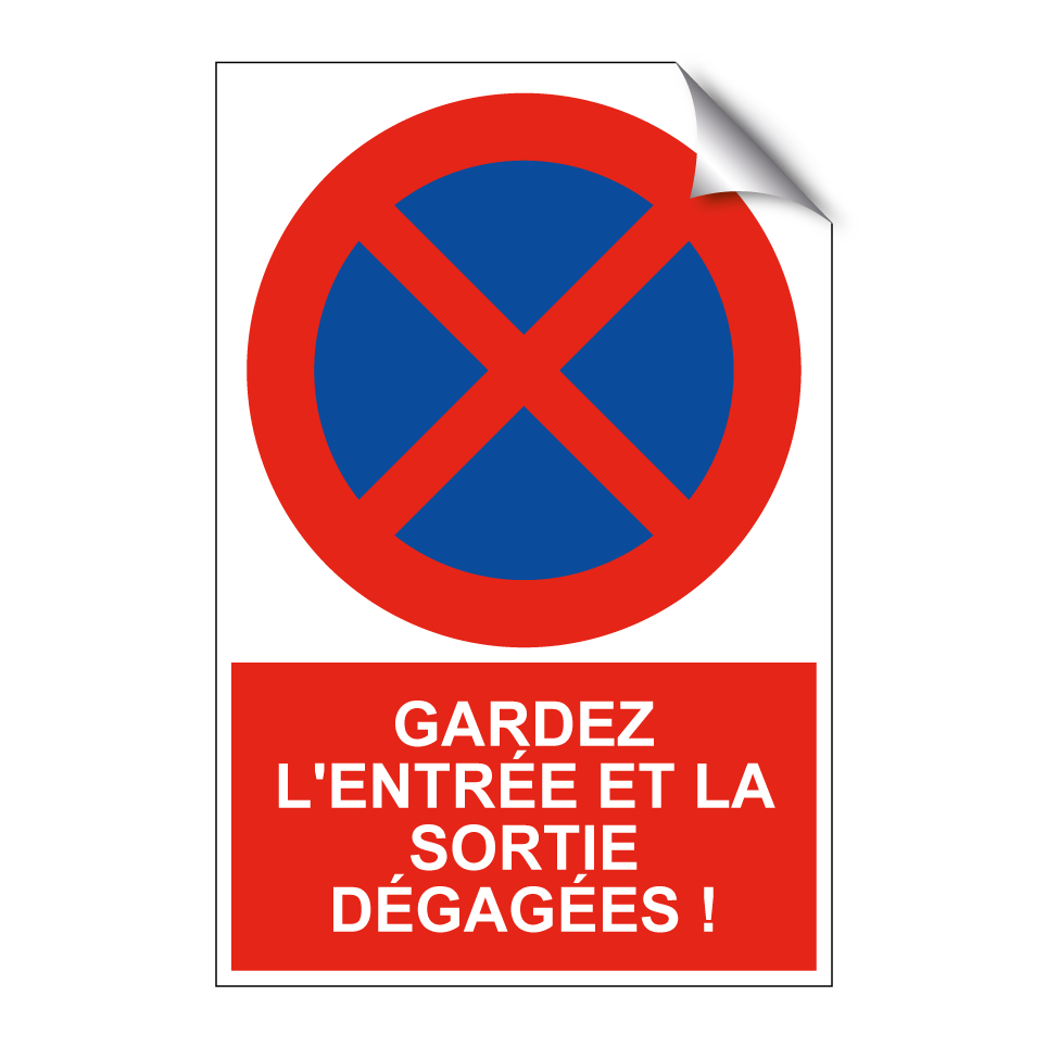 Panneau d'interdiction de stationner avec le texte : "Gardez l'entrée et la sortie dégagées !" et une symbolique claire.