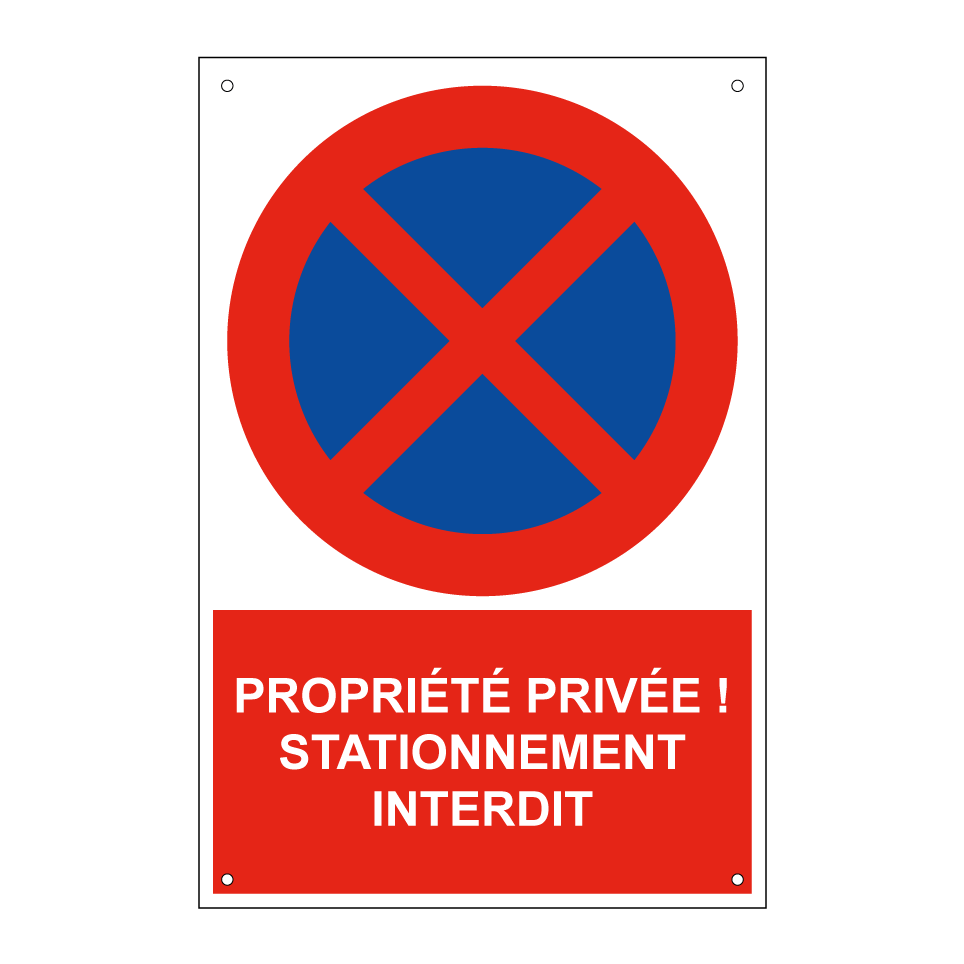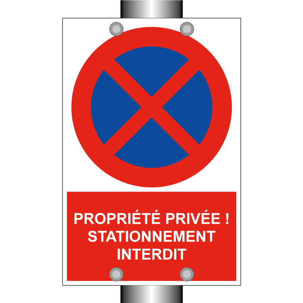 Panneau d'interdiction de stationner avec le texte : "Propriété privée ! Stationnement interdit." et une symbolique claire.