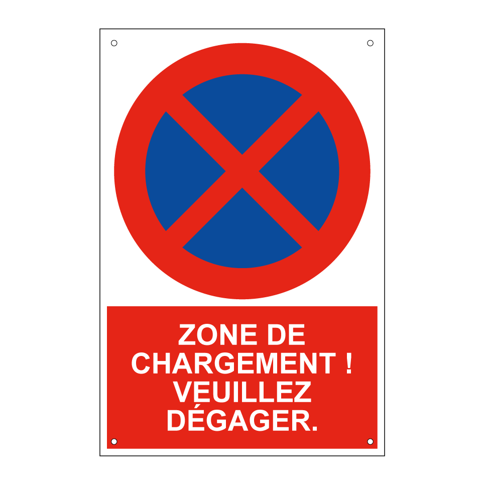 Panneau d'interdiction de stationner avec le texte : "Zone de chargement ! Veuillez dégager." et une symbolique claire.